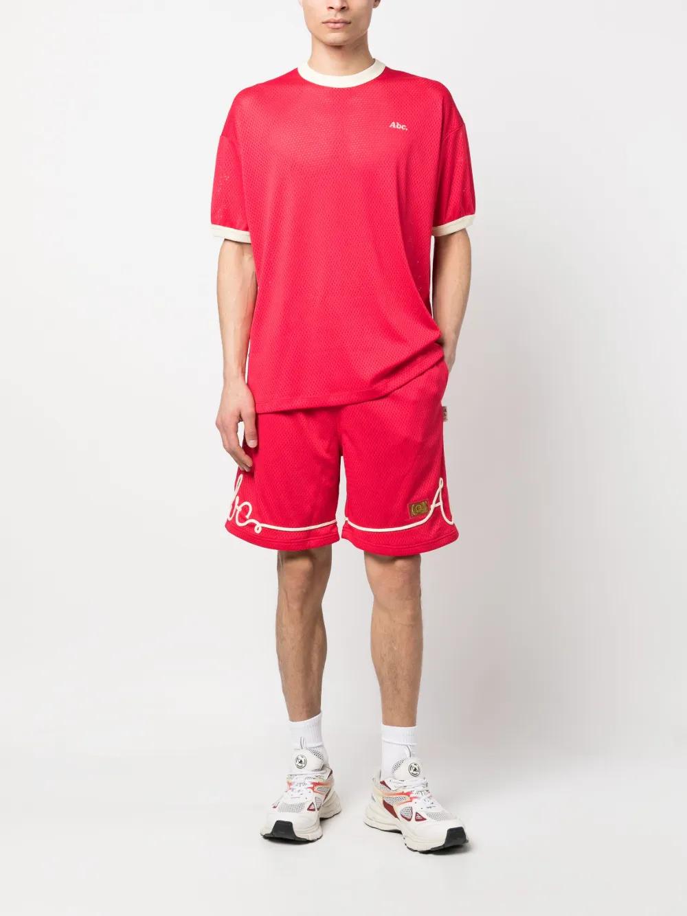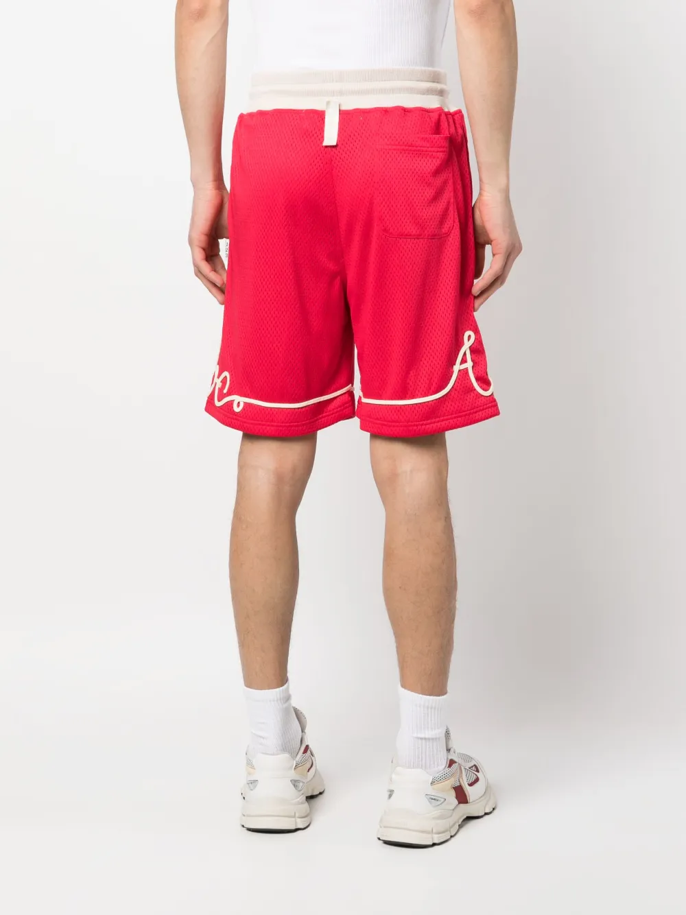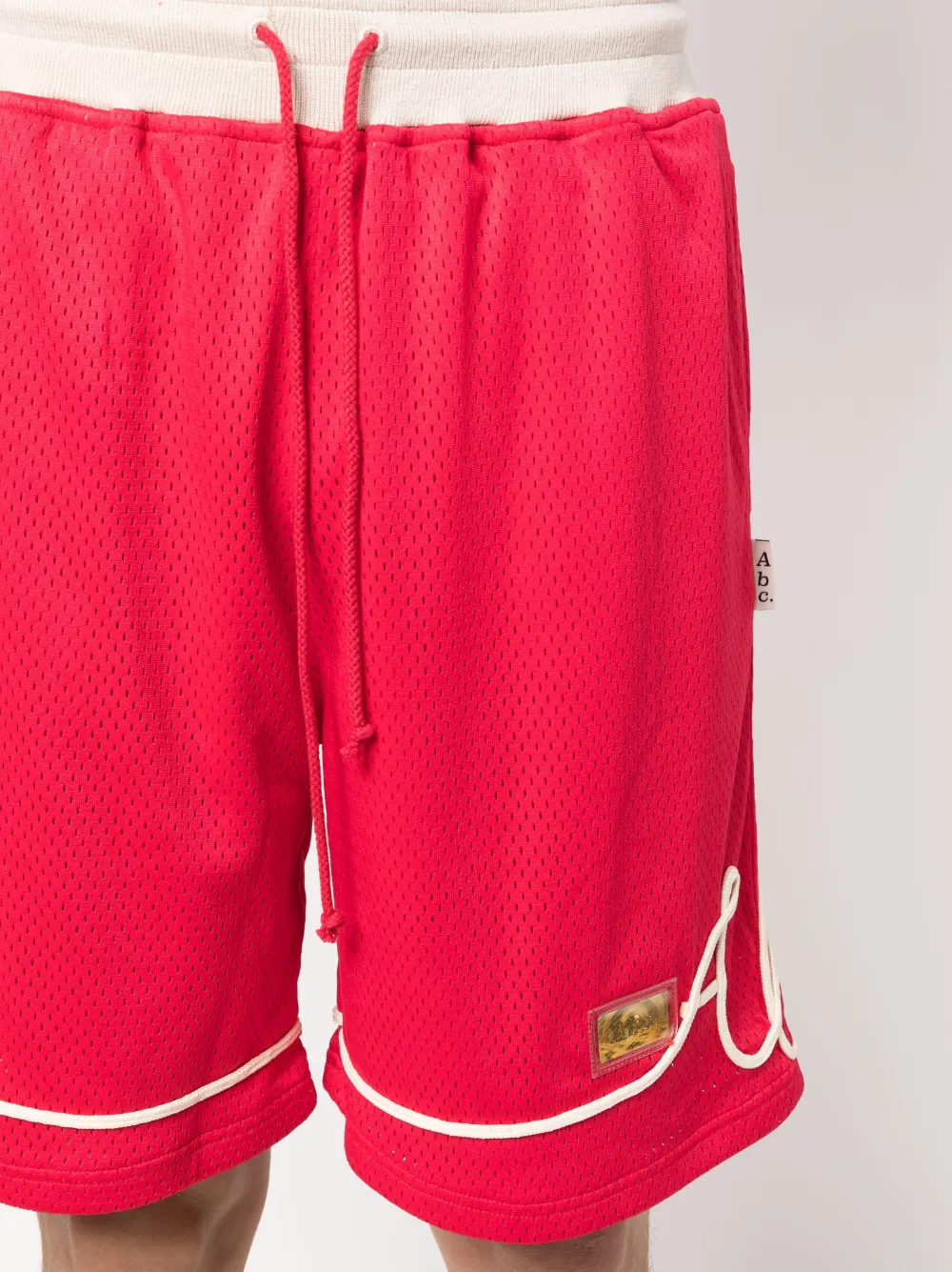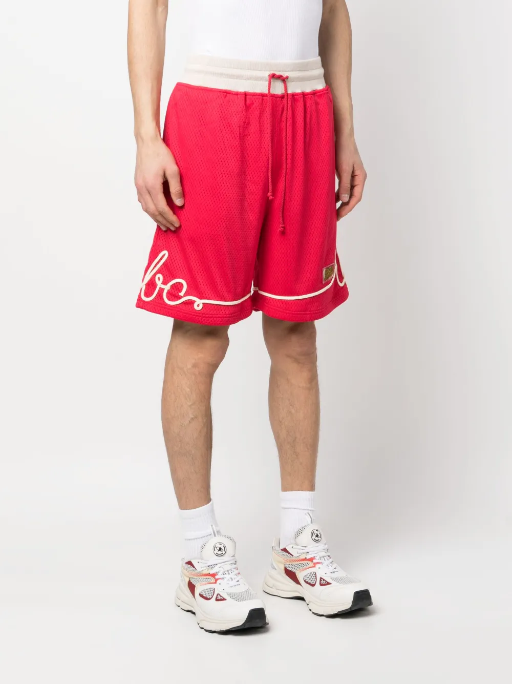 Ярко-красный, кремовый, смесовый хлопок, сетчатые вставки, логотип-аппликация, маленькая подвеска с логотипом, кулиска на талии, два прорезных кармана по бокам, накладной карман сзади и длина по колено.