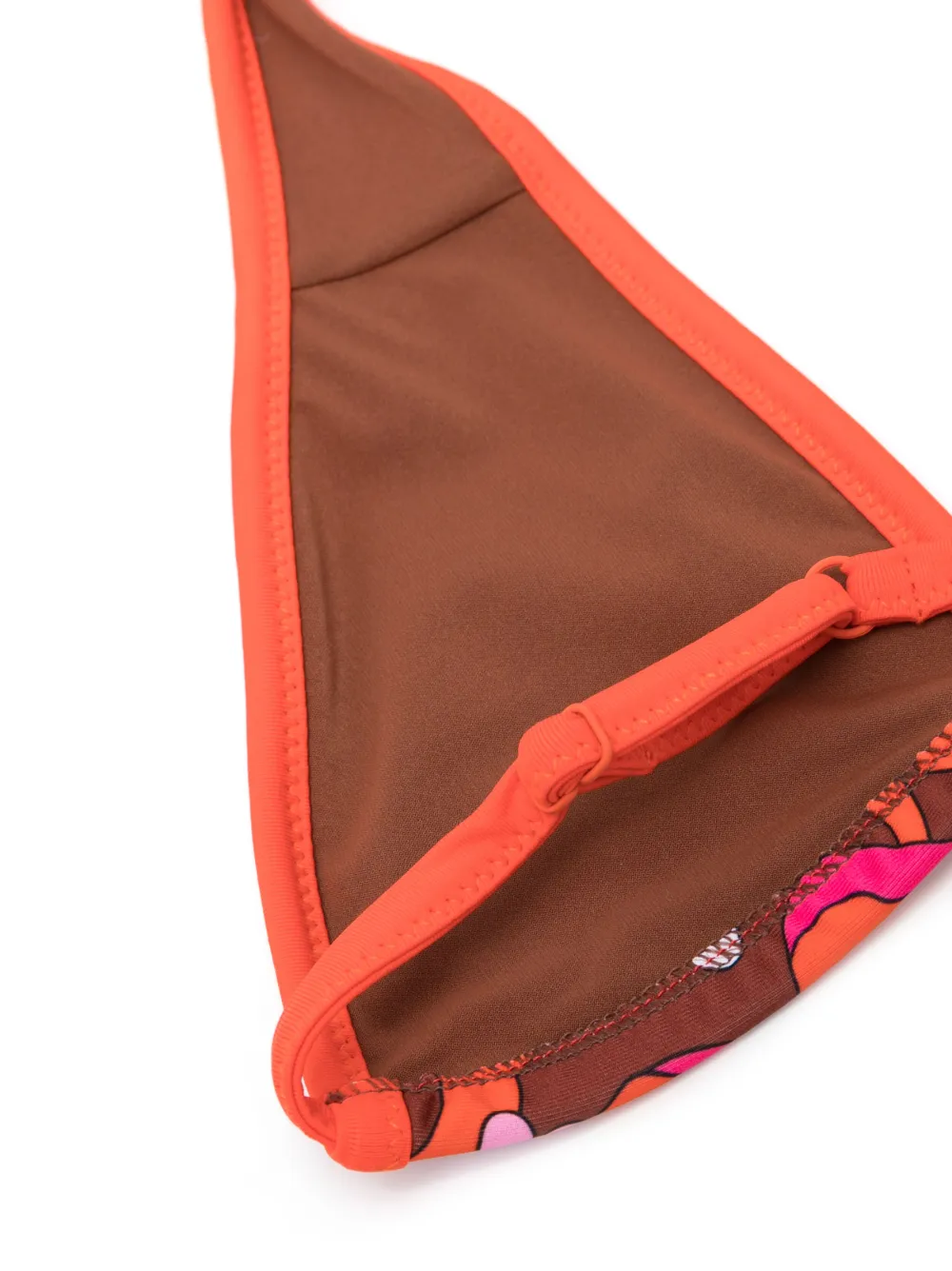 Тыквенно-оранжевый, разноцветный, эластичный материал, сплошной цветочный принт, нашивка с логотипом сзади, треугольная чашка, завязки вокруг шеи и плавки бикини с завязками по бокам. Пожалуйста, примеряйте купальники и пляжные шорты только поверх собственного белья.