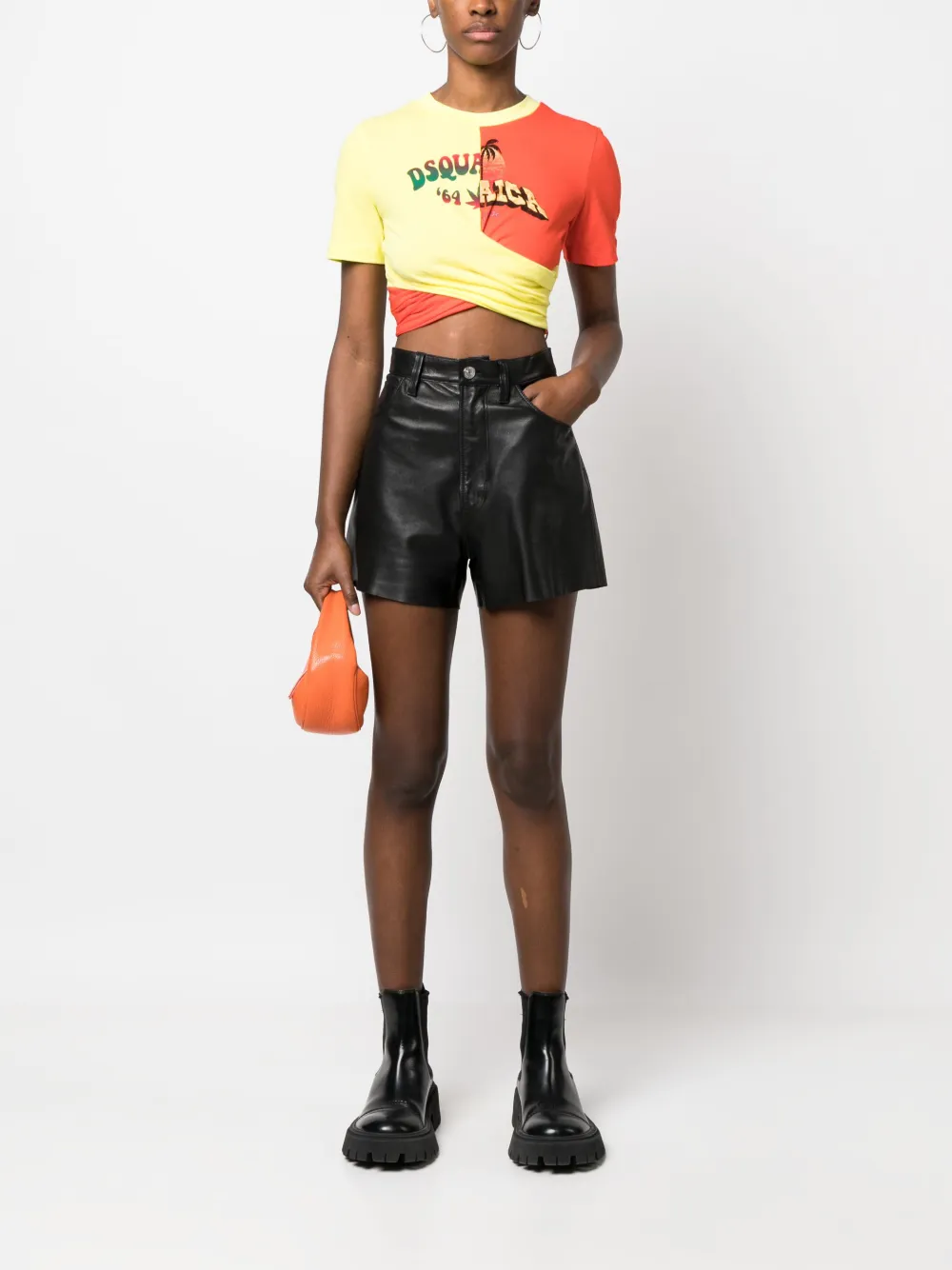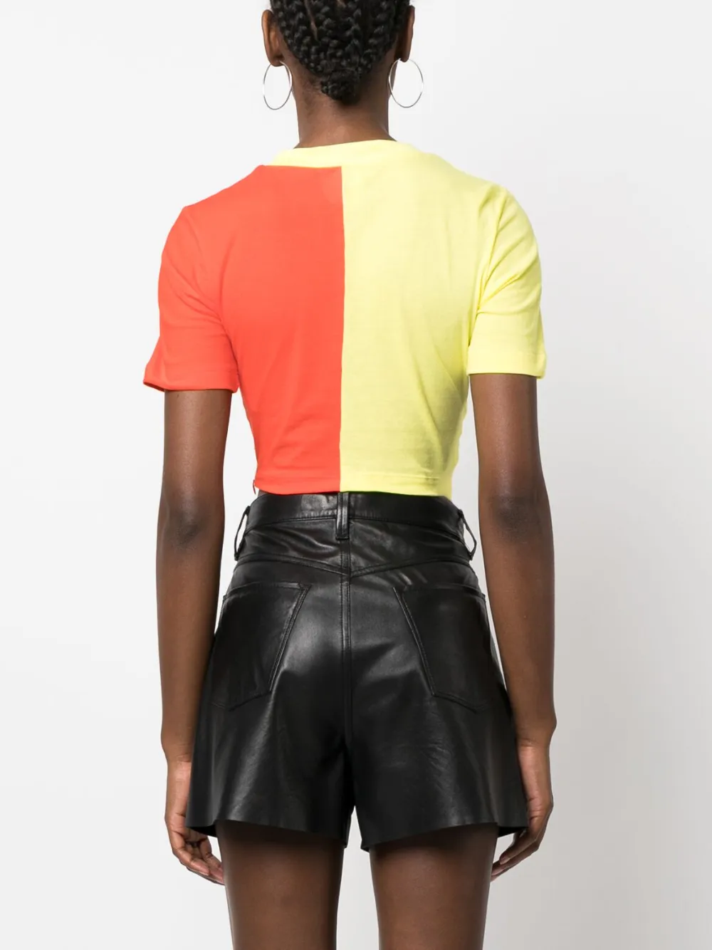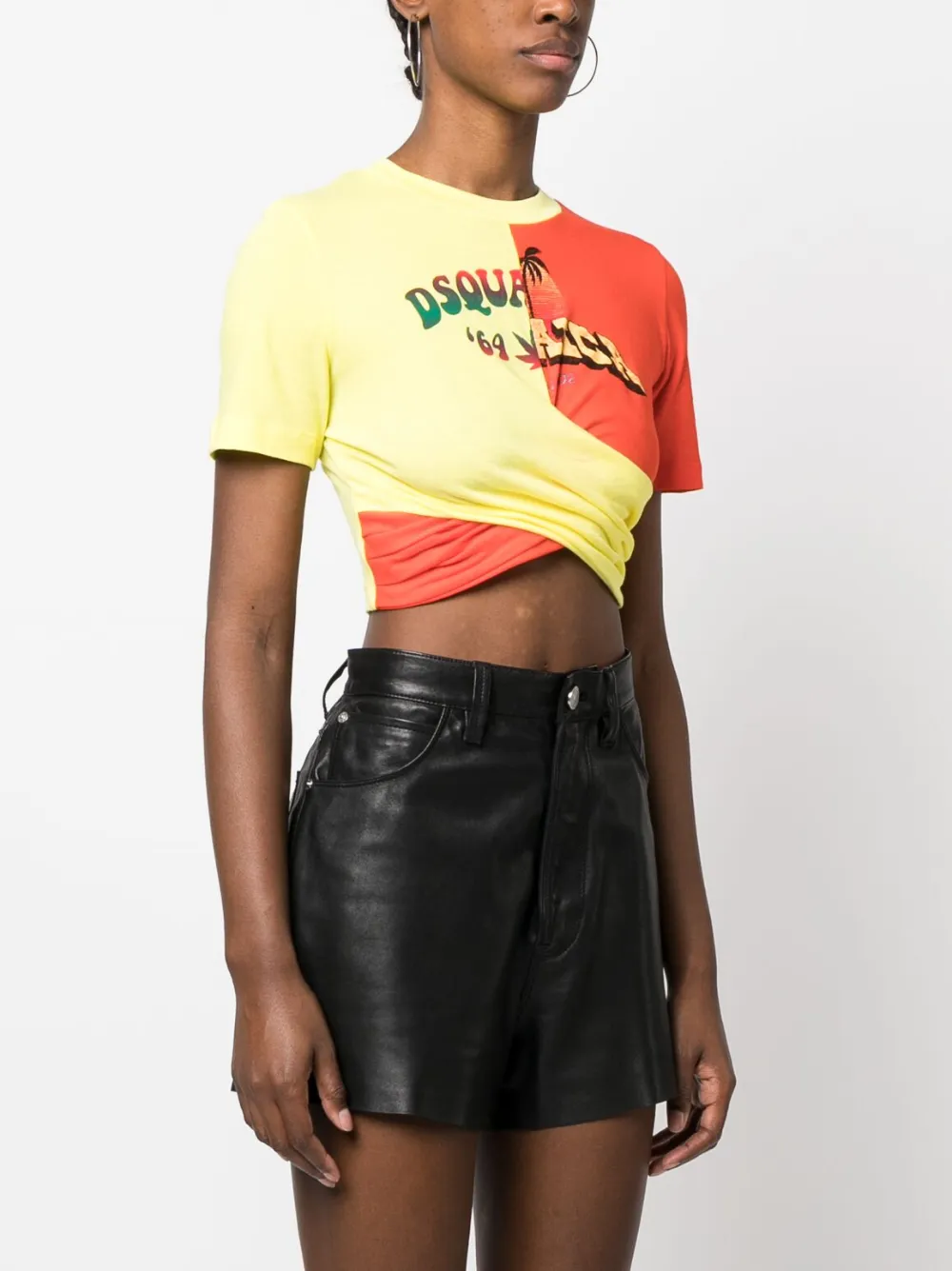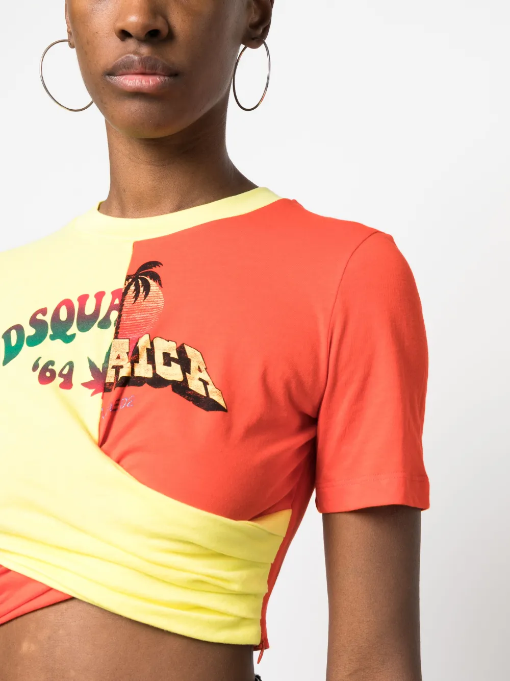 Кораллово-красный, пастельно-желтый, хлопок, модель на запах, логотип спереди, круглый вырез, короткие рукава и укороченная длина.