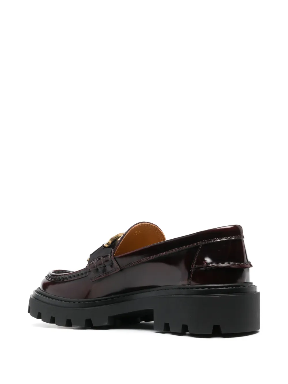 Темно-красный, телячья кожа, лакированная отделка, золотистый металлический логотип, кожаная стелька с логотипом и низкий блочный каблук.