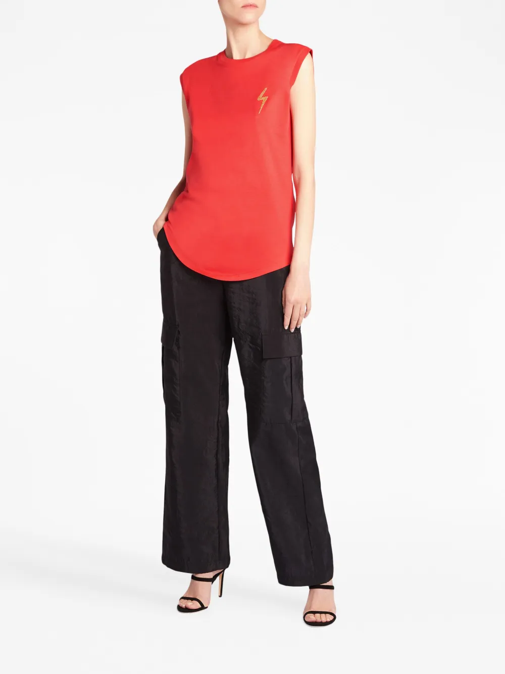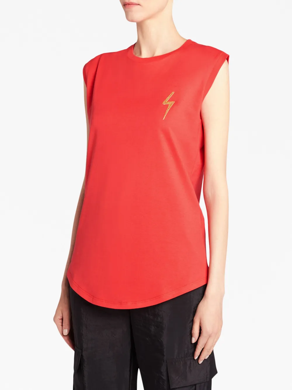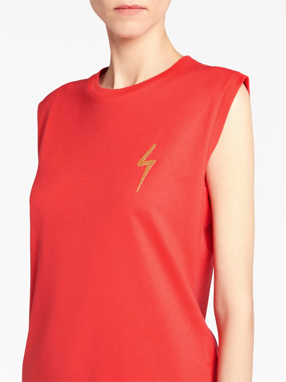 Ярко-красный, хлопок, вышитый логотип на груди, вышитый логотип сзади, круглый вырез, без рукавов и закругленный подол.