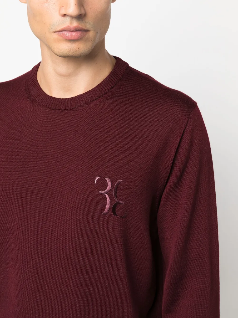 Бордовый, смесь шерсти и шелка, тонкая вязка, логотип в технике интарсия, вышитый логотип на груди, круглый вырез и длинные рукава.