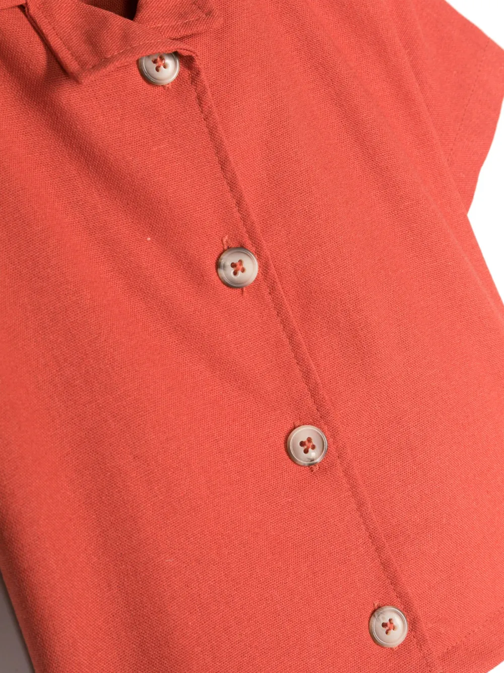 Кроваво-красный, смесовый лен, отложный воротник, застежка на пуговицах спереди, короткие рукава, приспущенные плечи, прямой подол и нашивка с логотипом внутри.