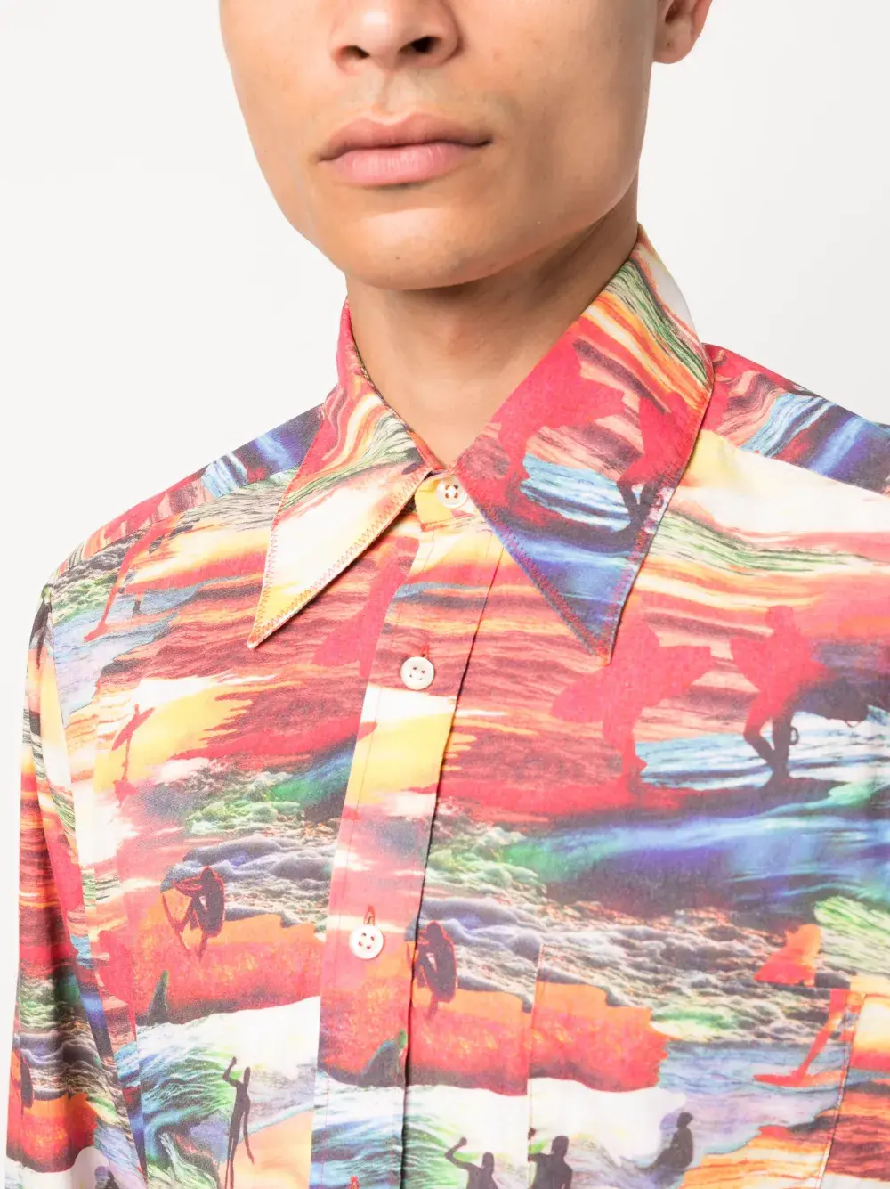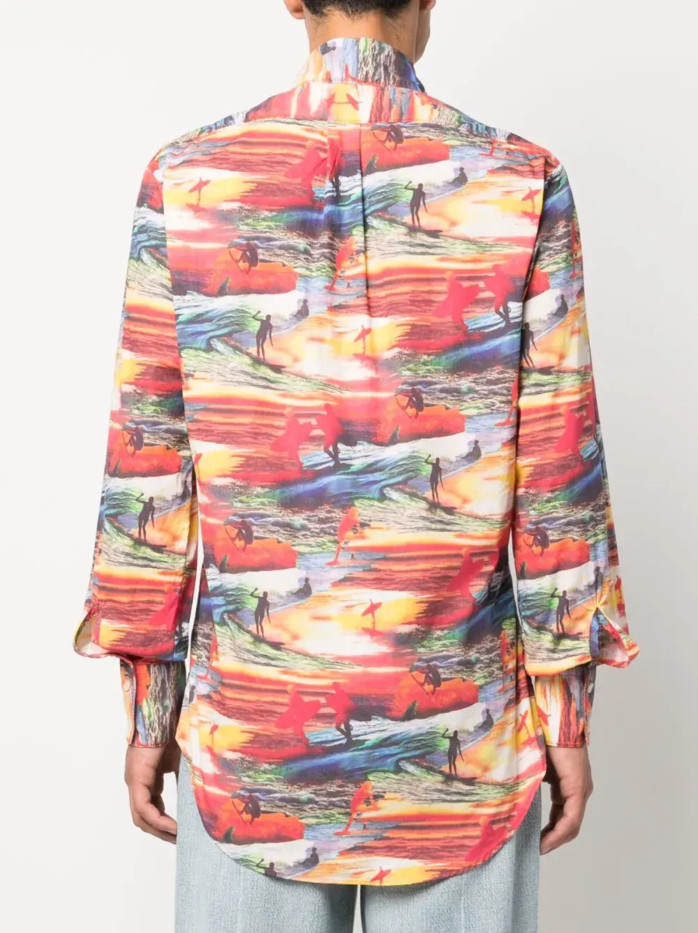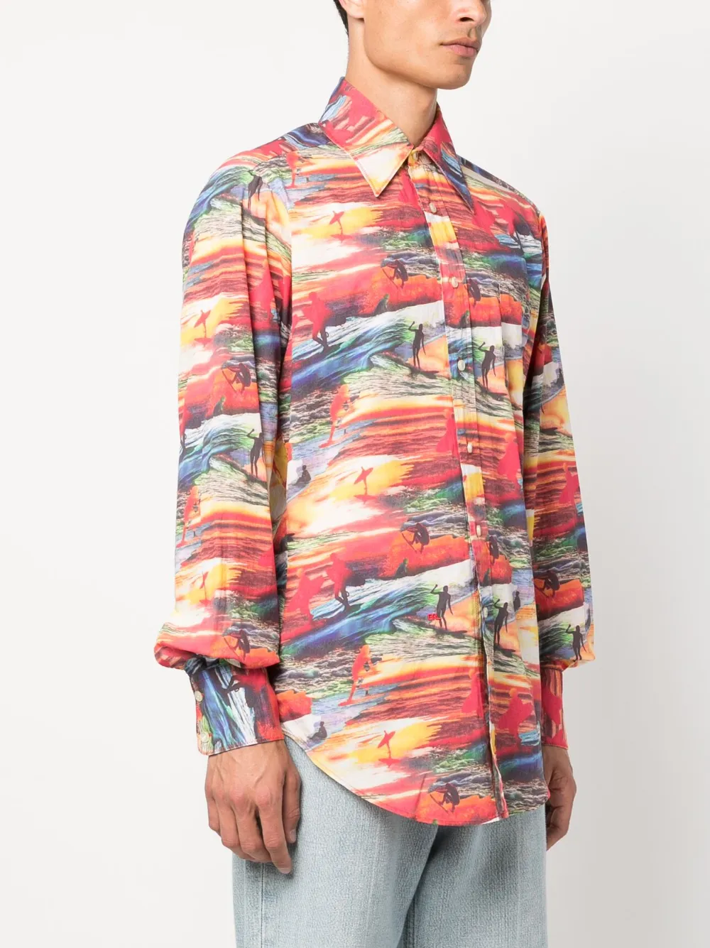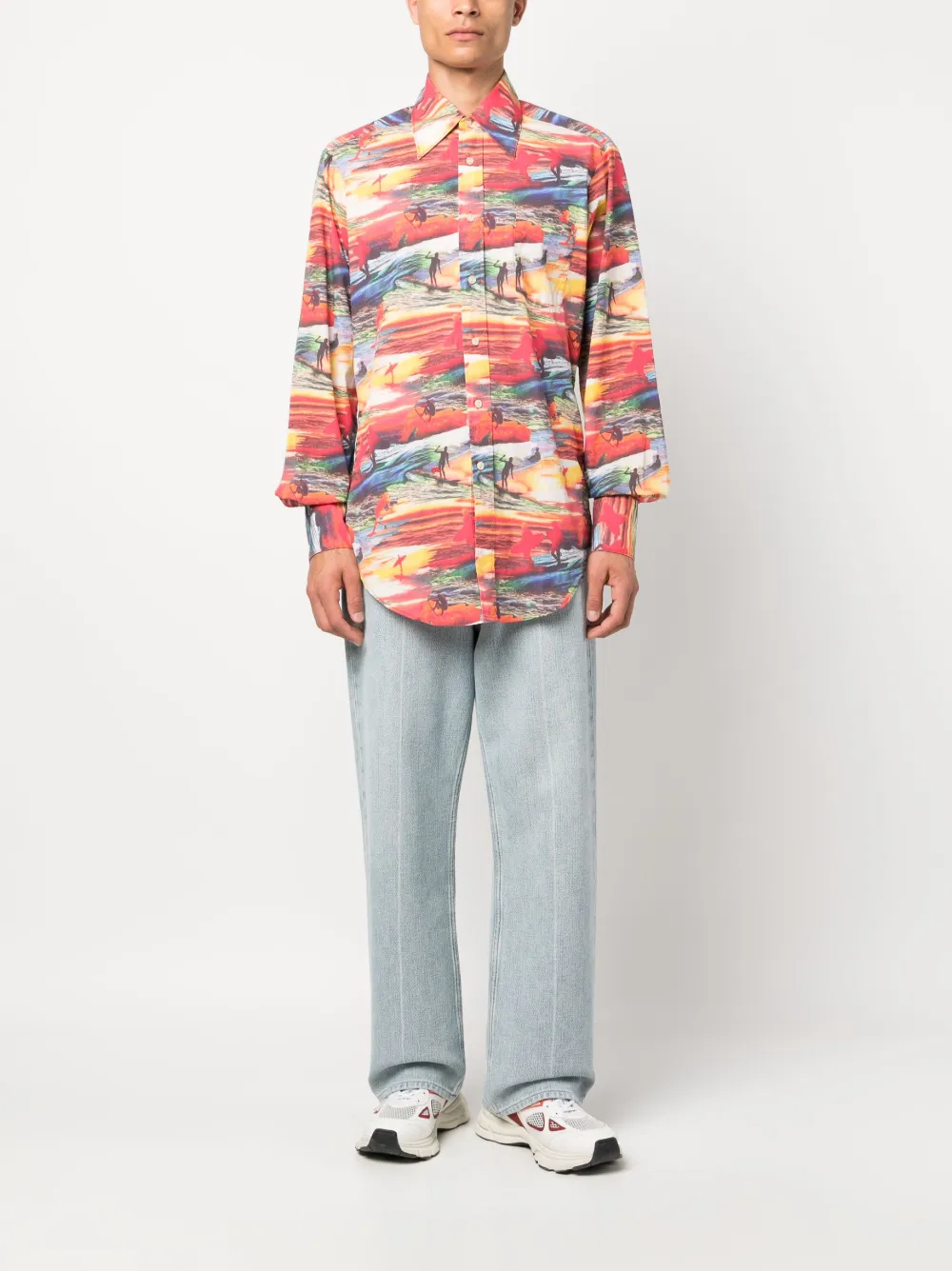 Разноцветный, хлопок, фотопринт, широкий заостренный воротник, застежка на пуговицах спереди, длинные рукава, манжеты на пуговицах и закругленный подол.