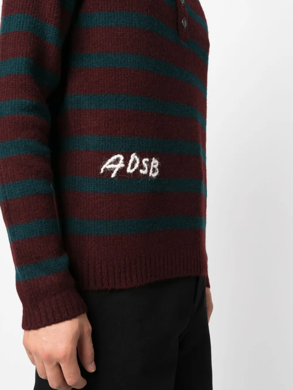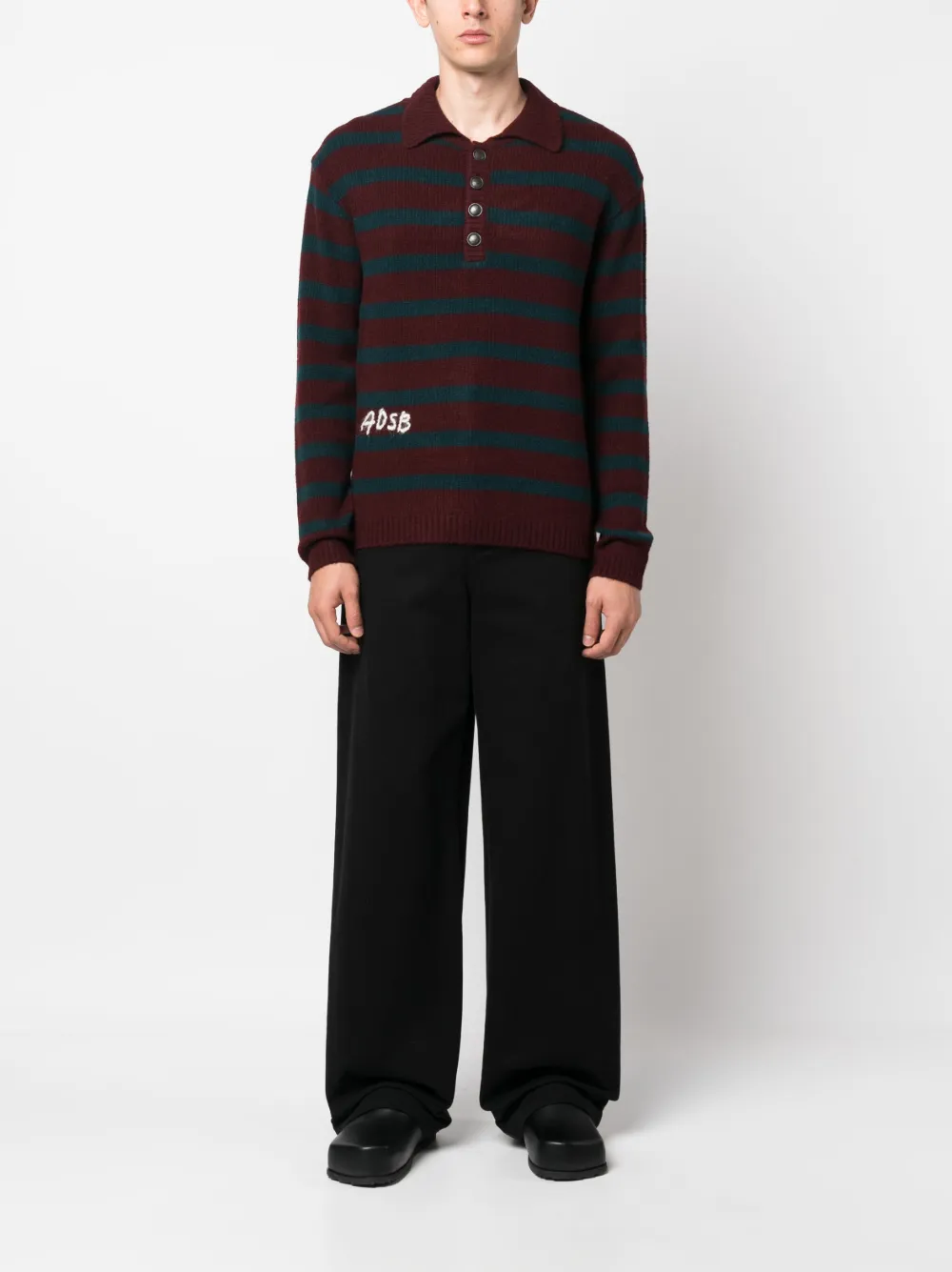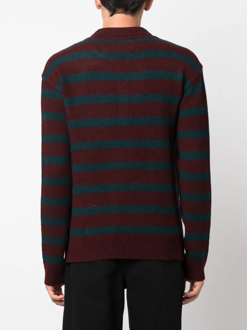 Винно-красный, темно-зеленый, вышитый логотип спереди, трикотажный материал, узор в горизонтальную полоску, воротник поло, планка на пуговицах спереди и длинные рукава.