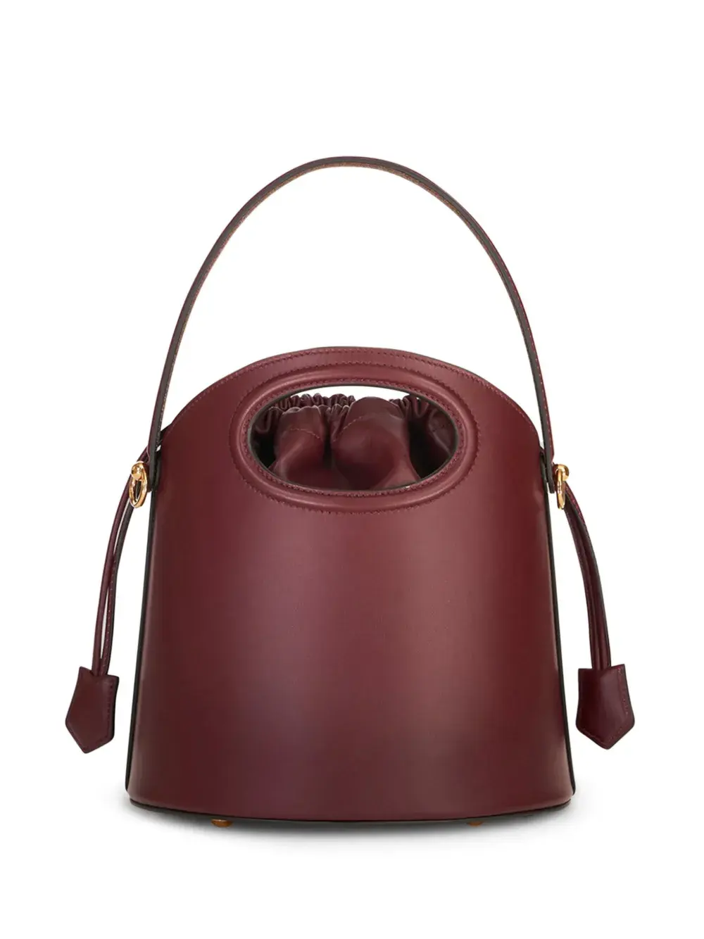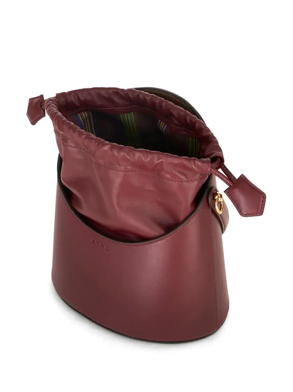 Бордовый, тисненый логотип спереди, модель ведро, регулируемый ремень на плечо, верхняя ручка, кулиска и основное отделение.