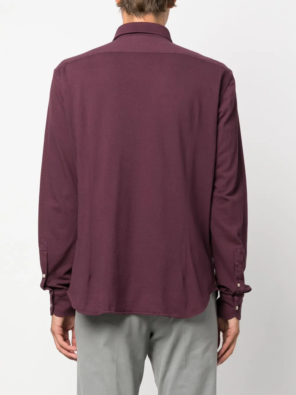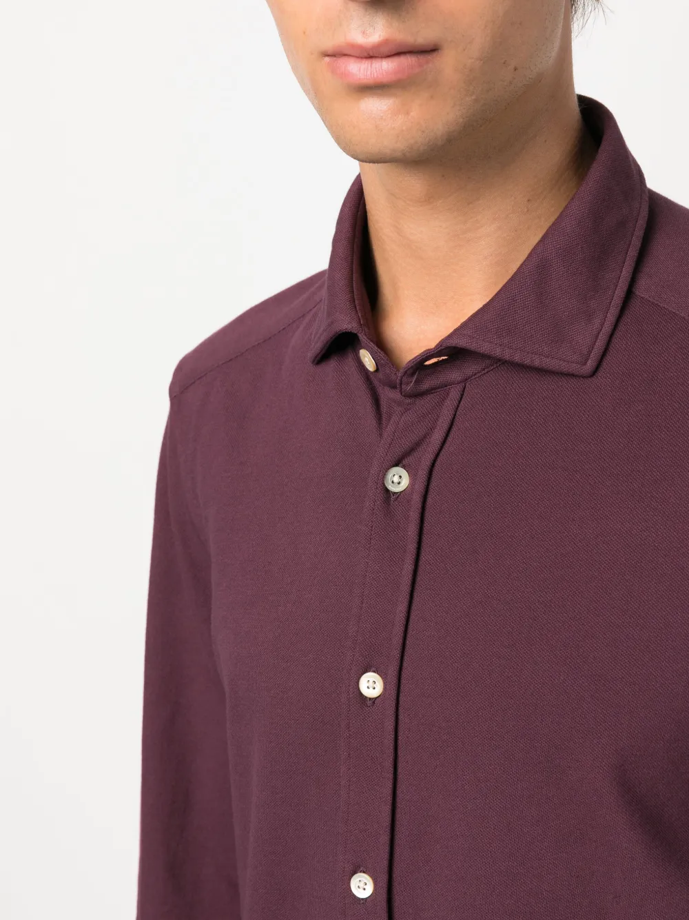Бордовый, хлопок, отложной воротник, застежка на пуговицах спереди, длинные рукава, манжеты на пуговицах и закругленный подол.