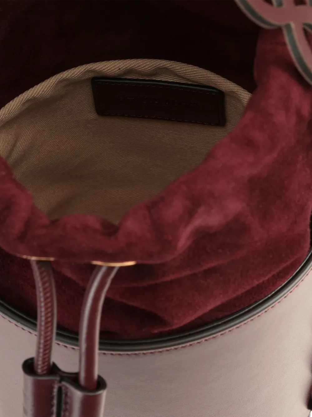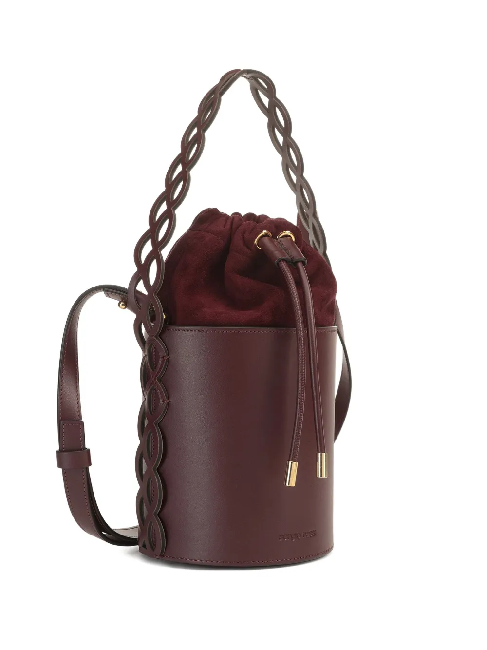 Бордовый кожаный корпус, вырезы, кожаная ручка, застежка на шнурок, замшевая подкладка