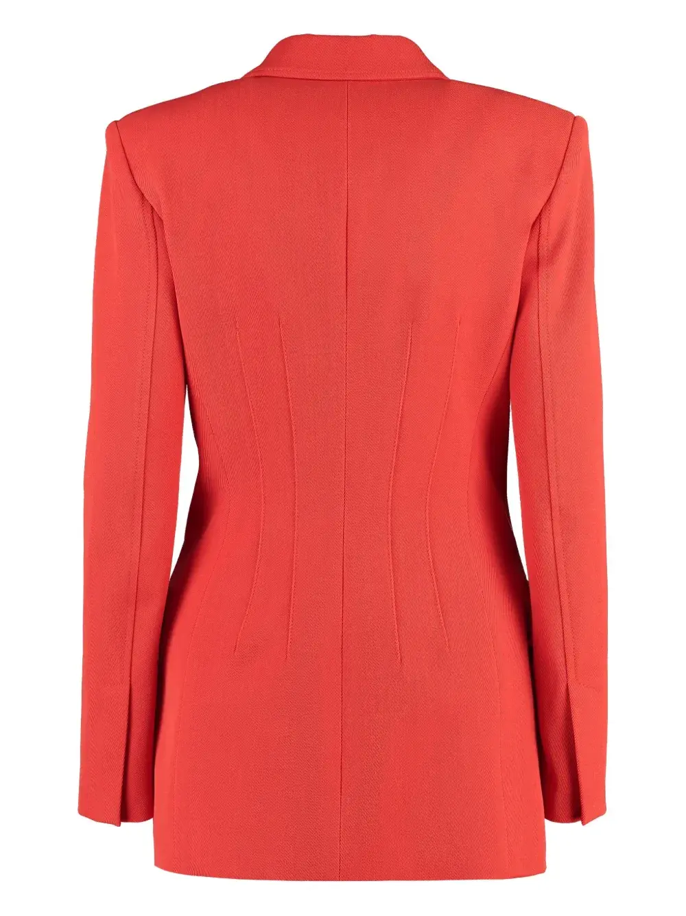 Кораллово-красные заостренные лацканы, застежка на пуговицы спереди, два боковых кармана с клапанами, длинные рукава