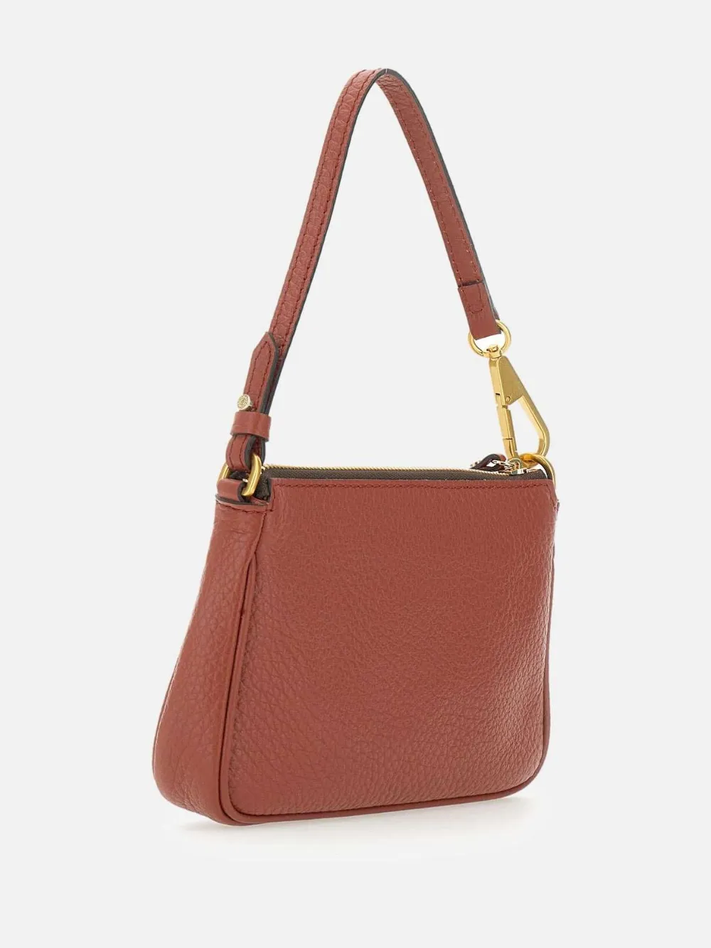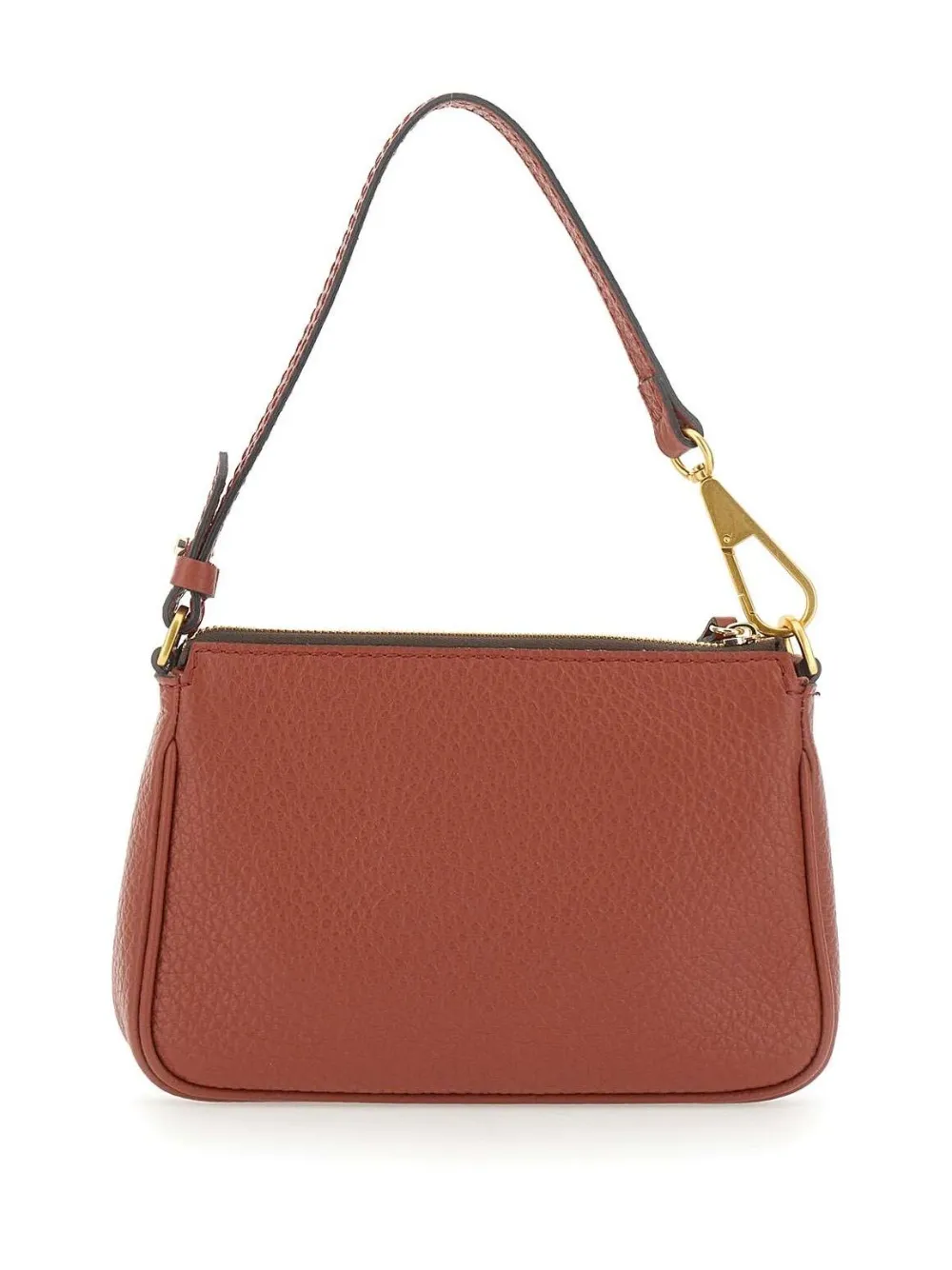 Текстурированная кожа кирпично-красного цвета, застежка-молния, верхняя ручка, фурнитура золотистого цвета