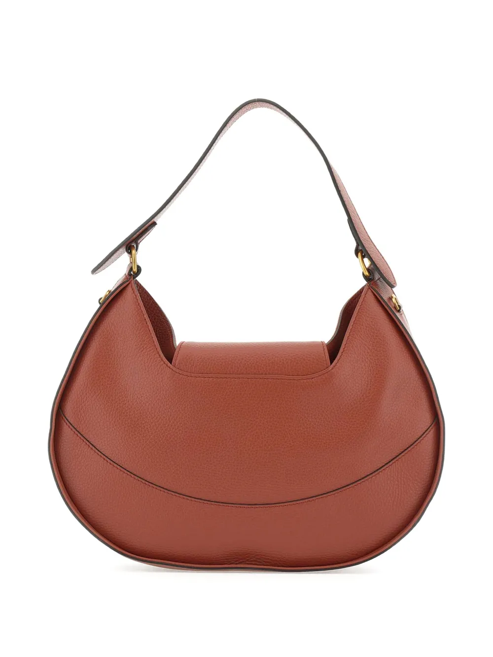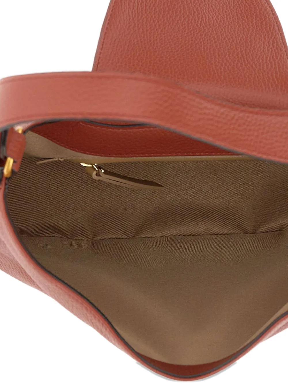 Текстурированная кожа кирпично-красного цвета, одинарная ручка сверху, застежка-клапан, фурнитура золотистого оттенка