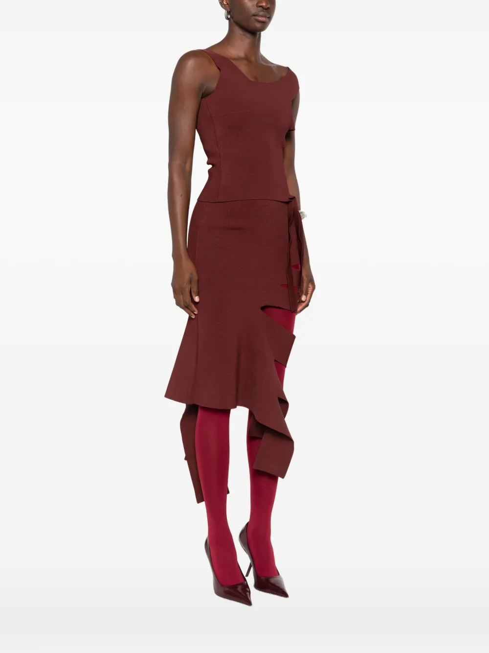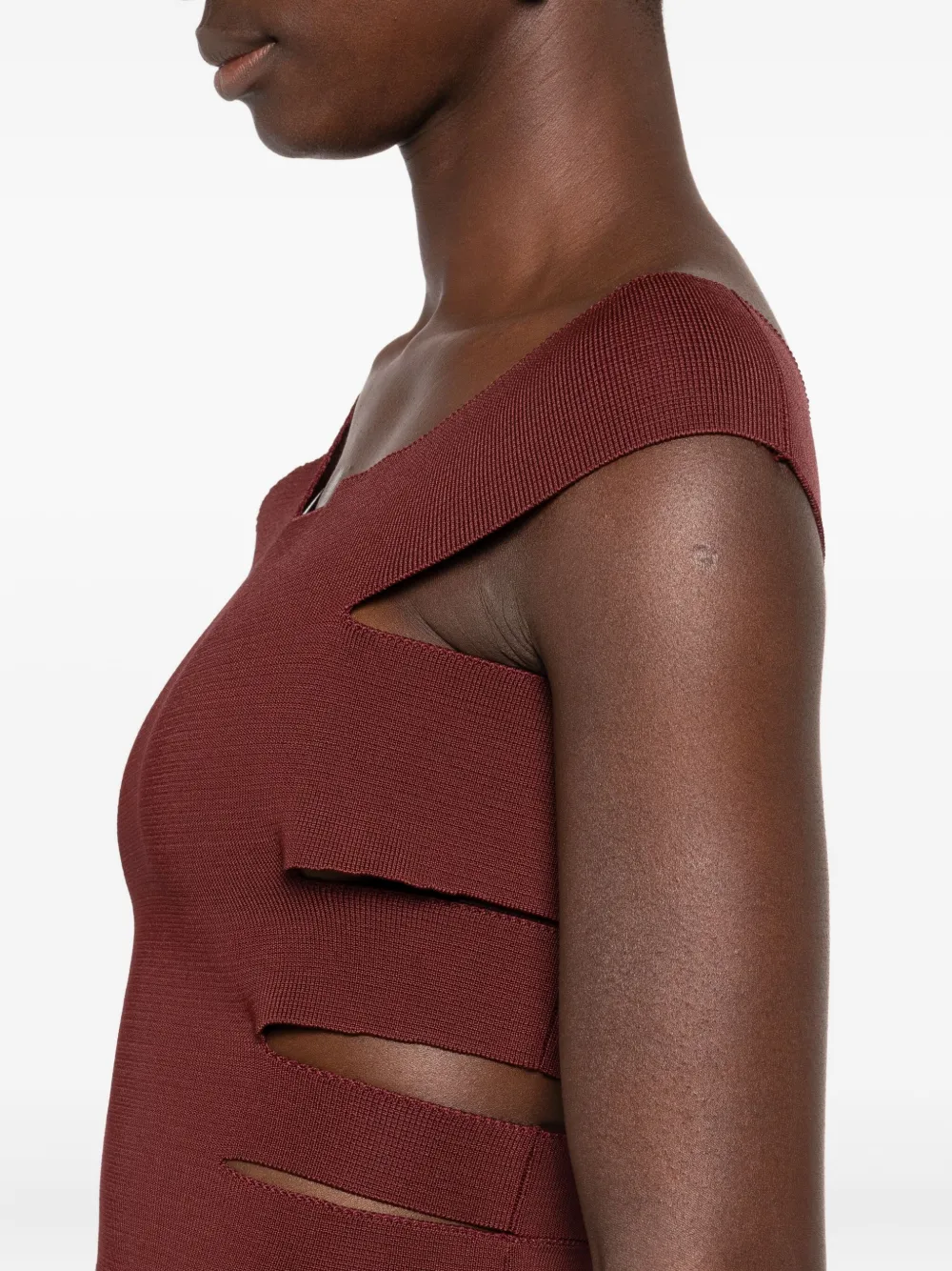 Бордовый дизайн на одно плечо, шнуровка по бокам, ребристая вязка