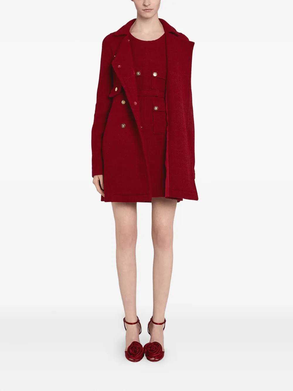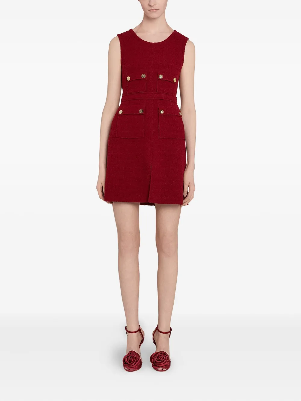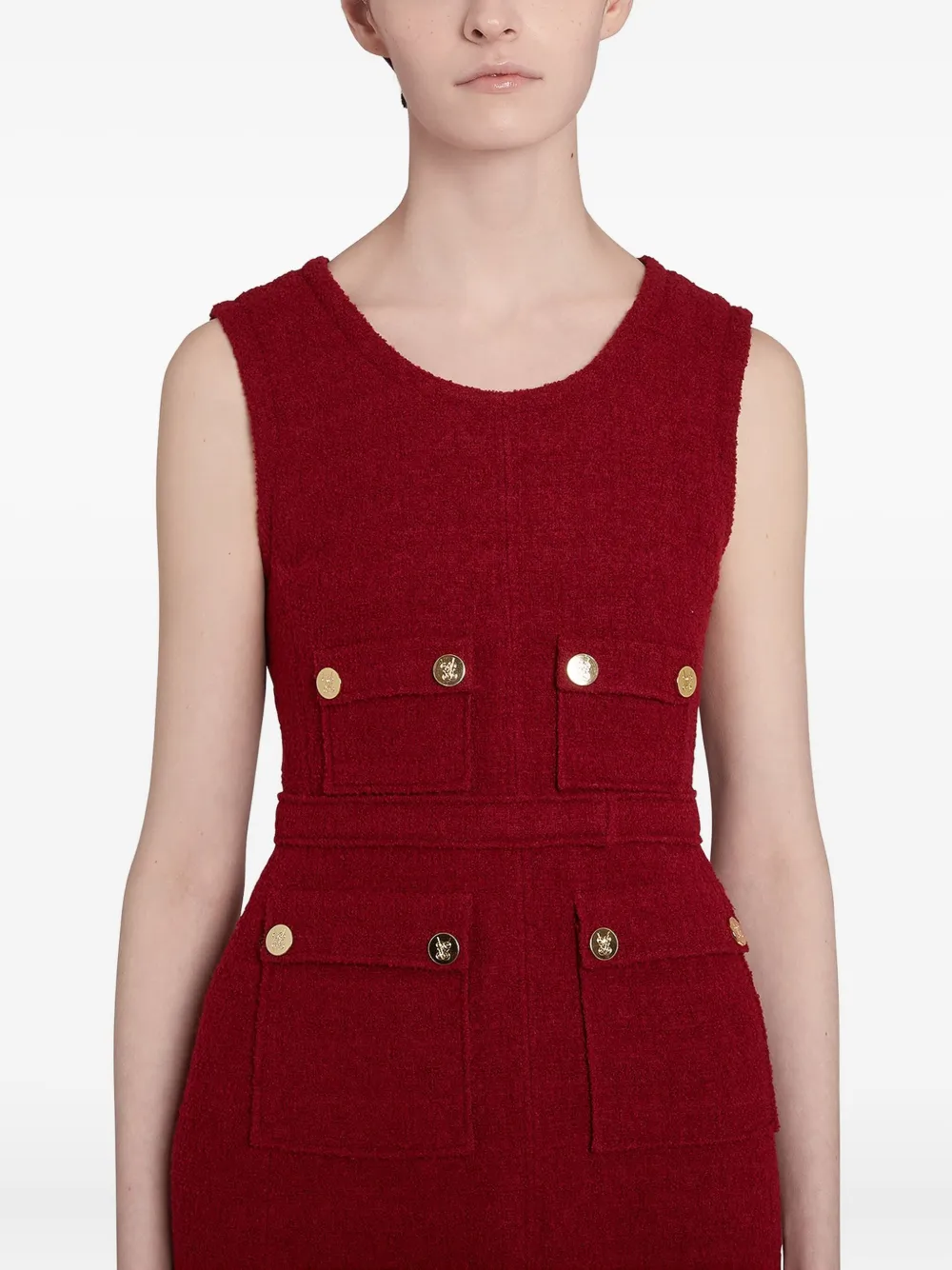 Темно-красная текстура букле, без рукавов, круглый вырез, золотые пуговицы, карманы с клапанами