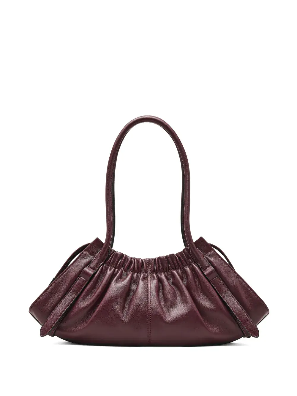 Красные присборенные детали, верхние ручки, застежка-молния, брелок для ключей, кожаный материал