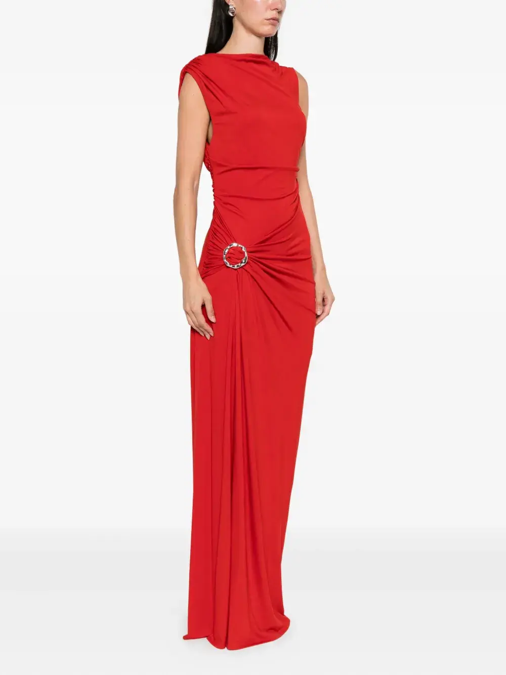 Красная драпированная ткань, асимметричный вырез, без рукавов, приталенный лиф, украшение в виде кольца