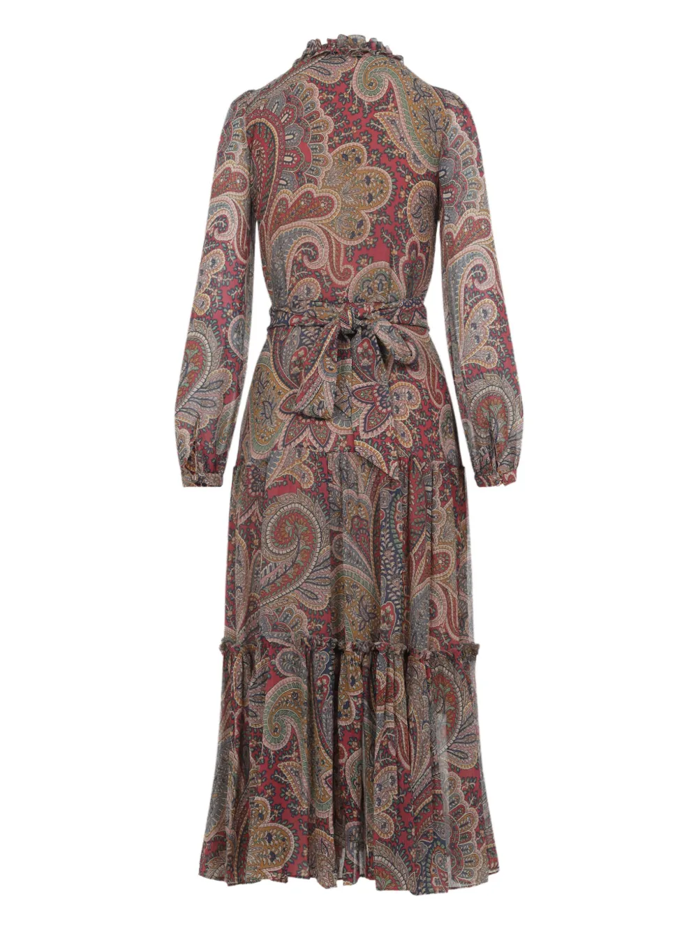 Красный узор пейсли, оборчатый вырез, длинные рукава, многоярусная юбка, завязывающийся пояс