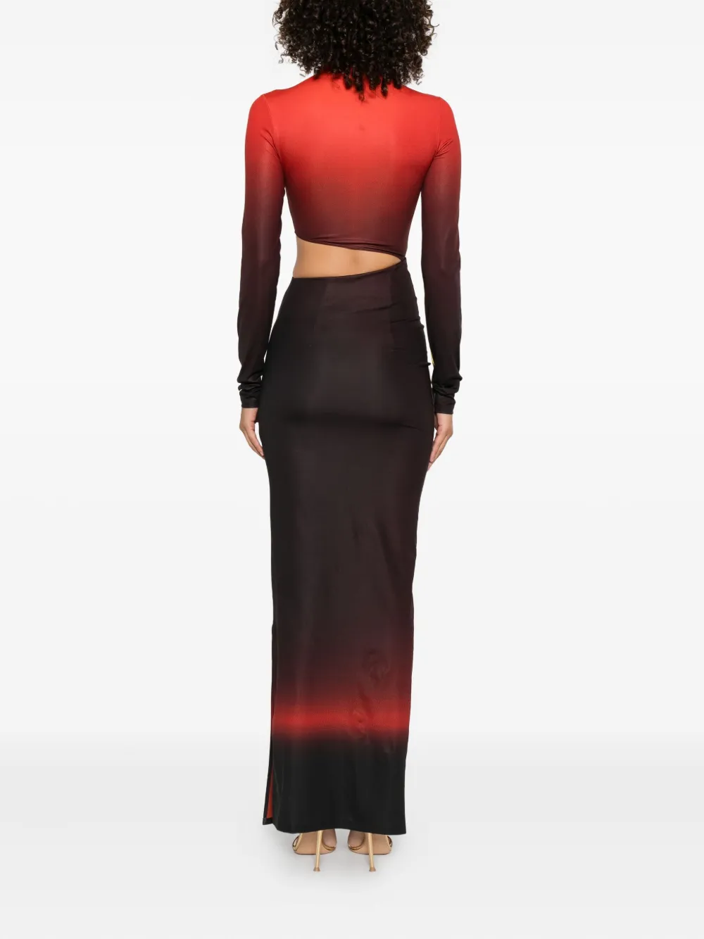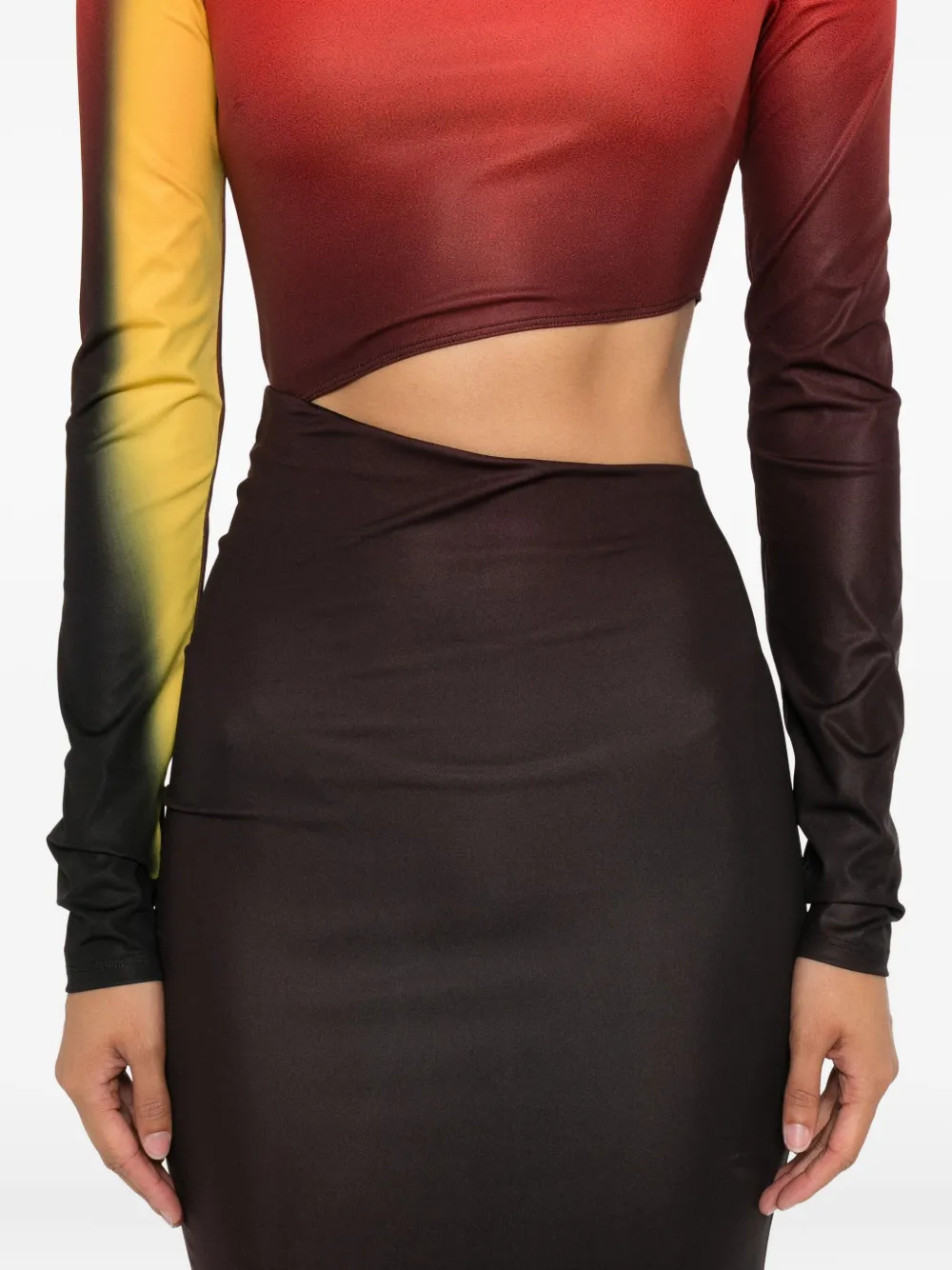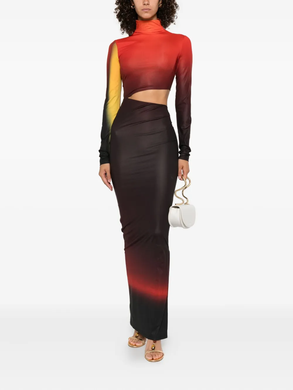 Красный градиентный принт, высокий ворот, длинные рукава, вырез