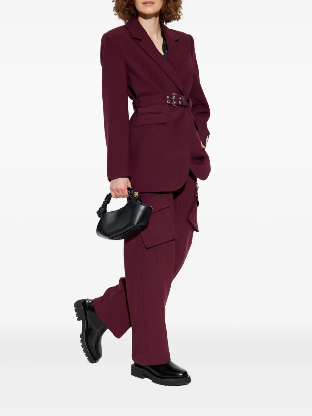 Бордовый ремень с пряжкой, заостренные лацканы, длинные рукава