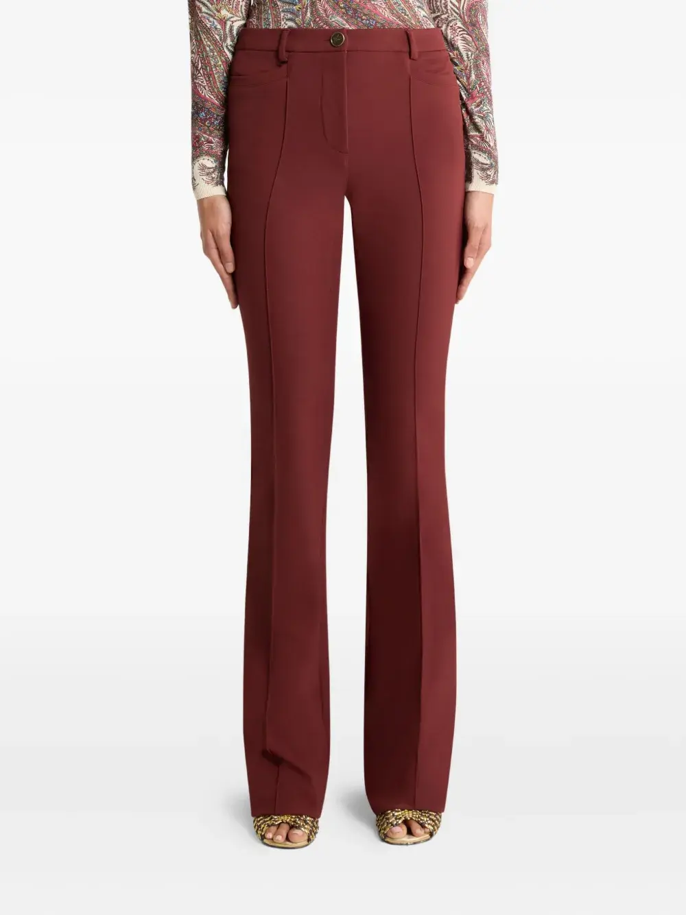 Темно-красные передние панели, швы, застежка на пуговицы, прорезные карманы, прямой крой, высокая талия