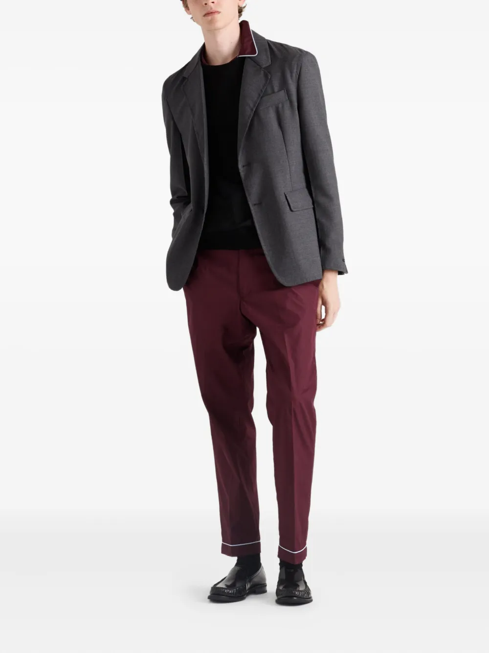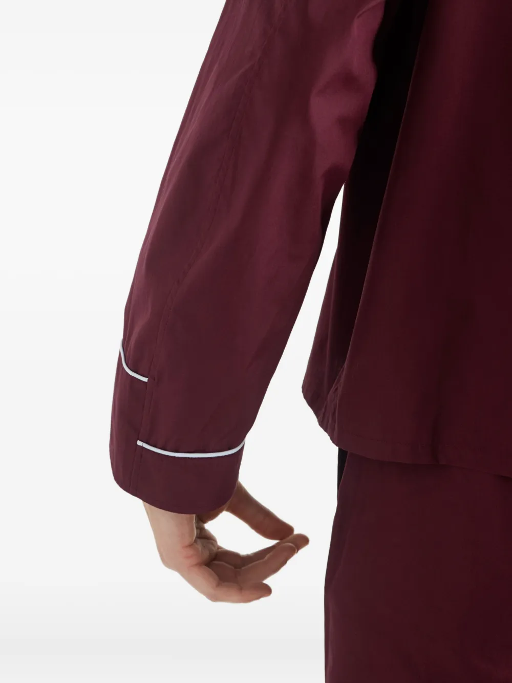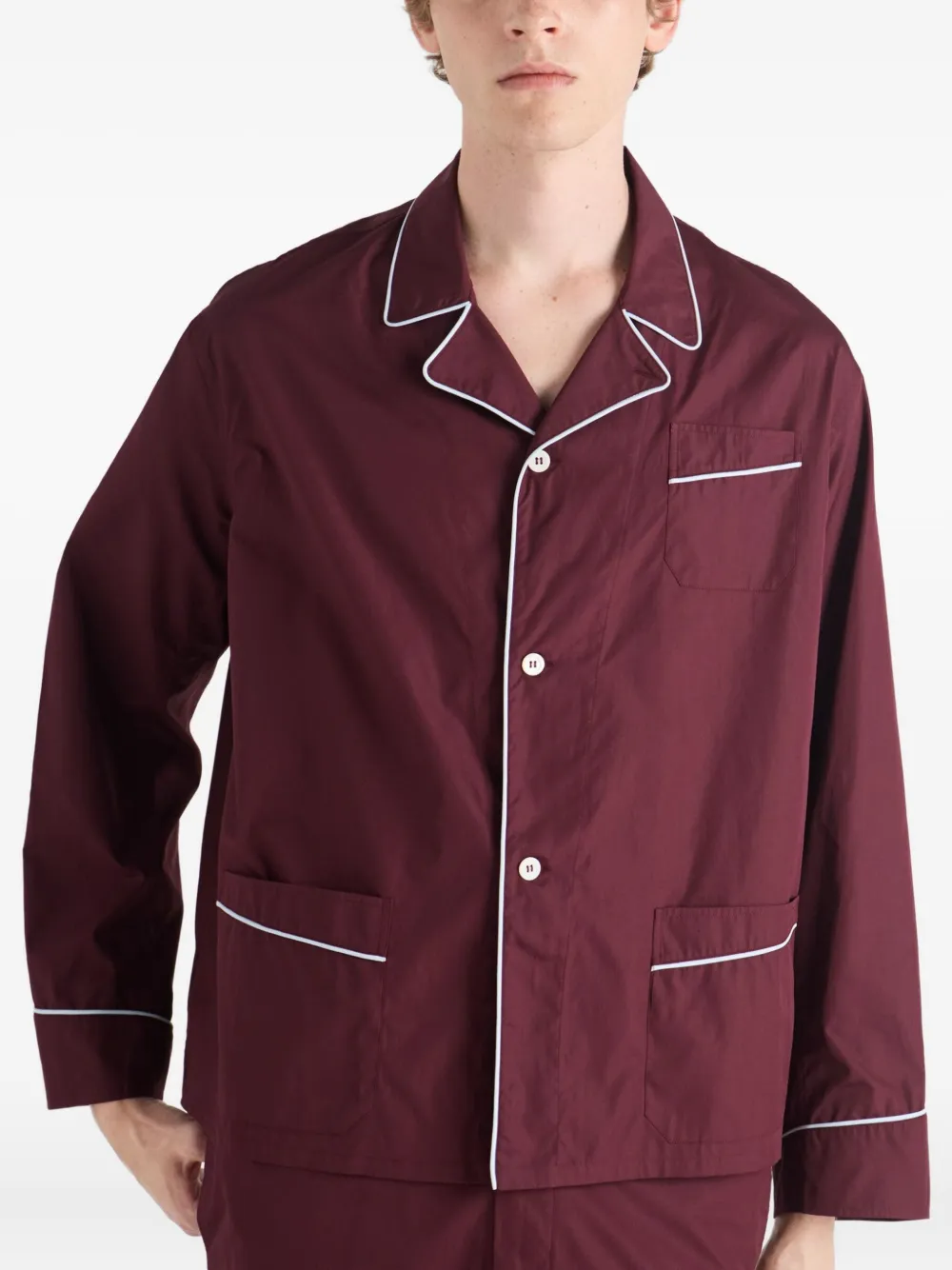 Застежка на пуговицы из бордового перламутра, нагрудный карман, треугольный логотип, прямой подол