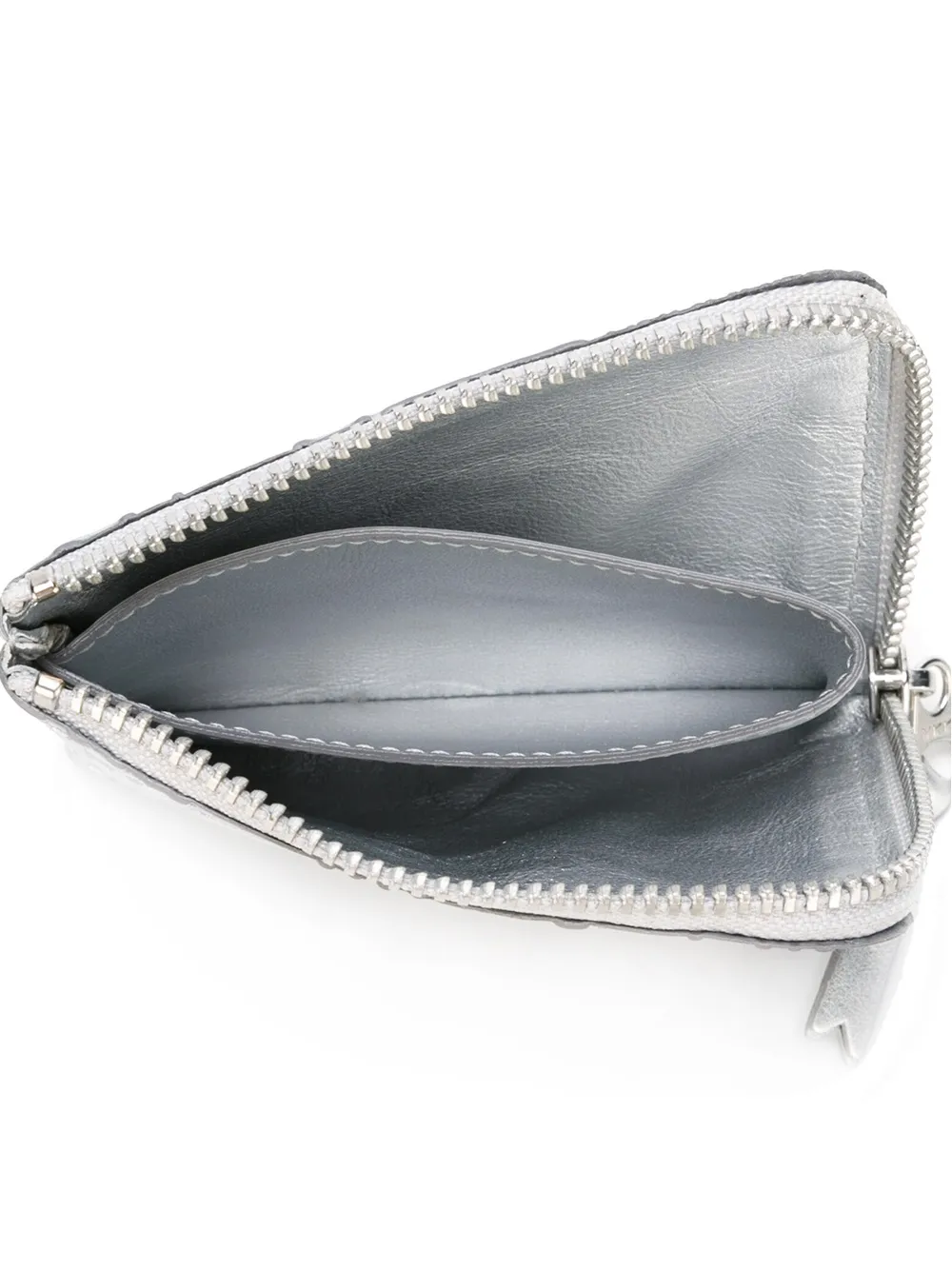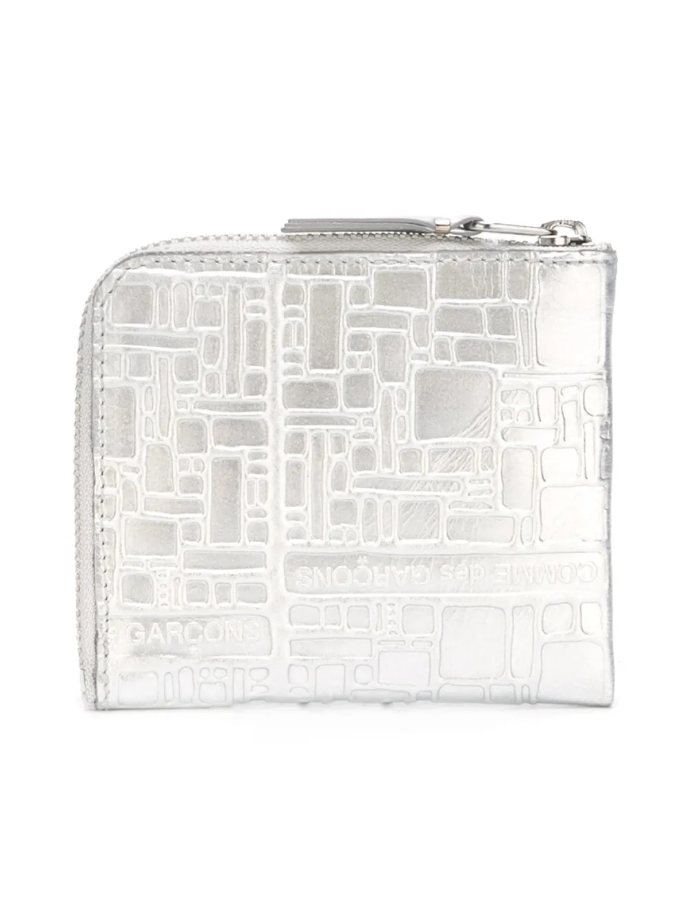 Серебристый кожаный кошелек 'Embossed Logo' от Comme Des Garçons. Застежка на молнии, тисненая деталь, тисненый логотип спереди, главный внутренний отдел.