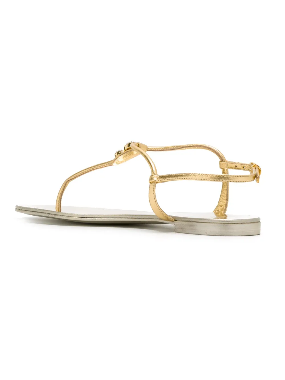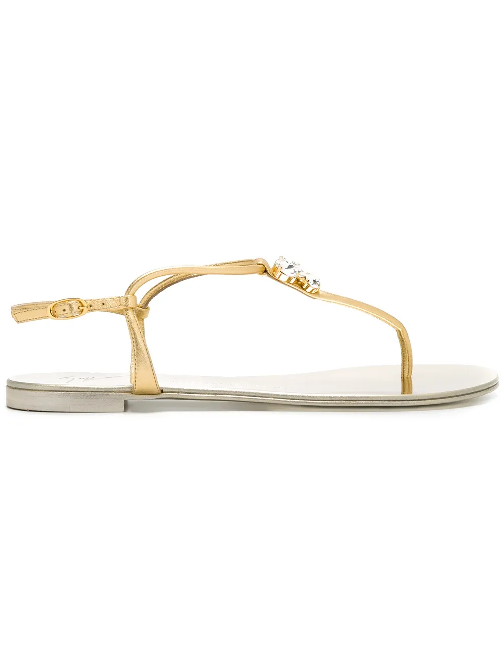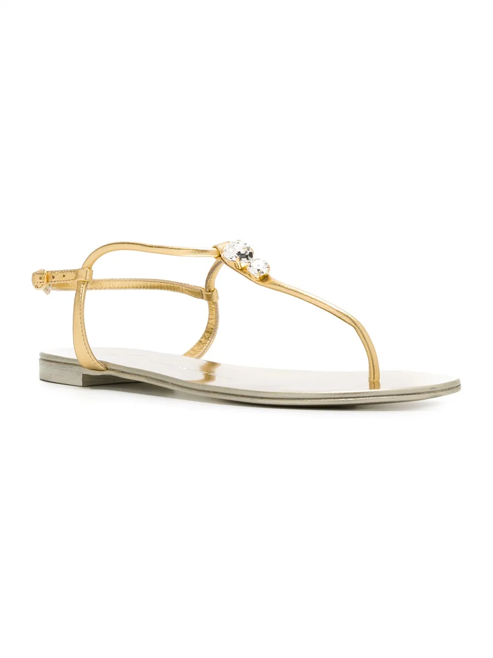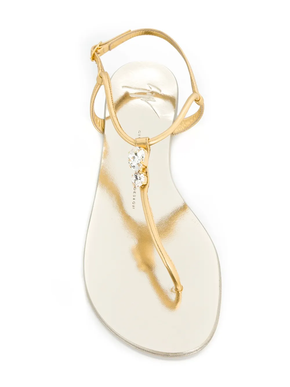 Золотистые кожаные сандалии с тонкими ремешками от Giuseppe Zanotti Design. Украшение из кристаллов, ремешок на щиколотке и пряжка сбоку, стелька с тиснением бренда, плоский каблук.