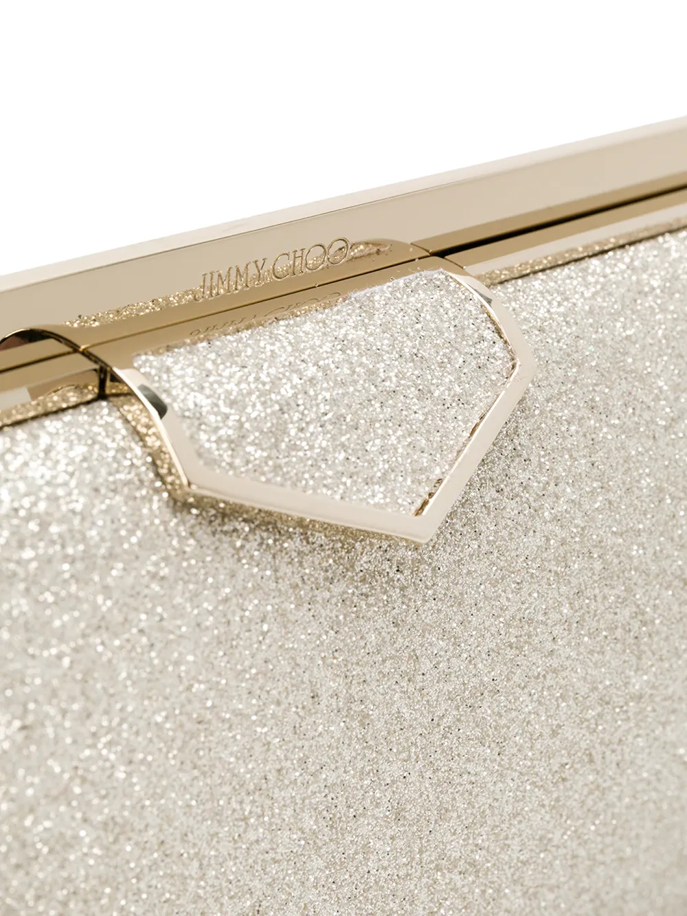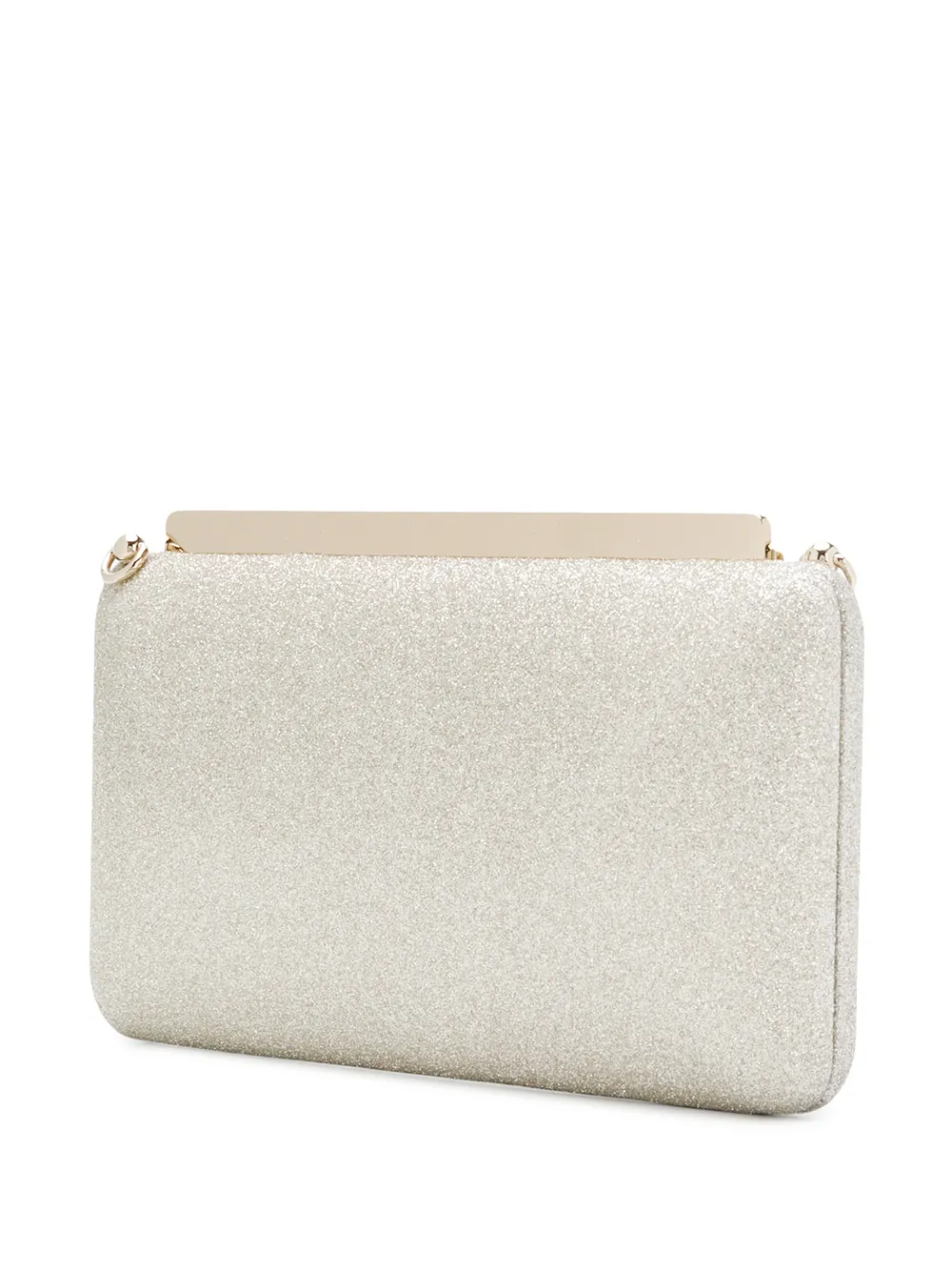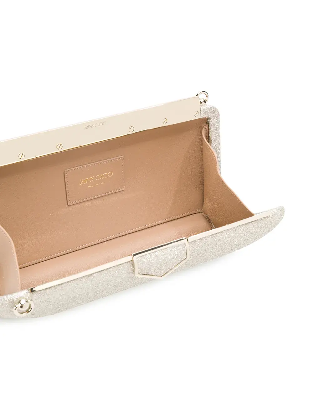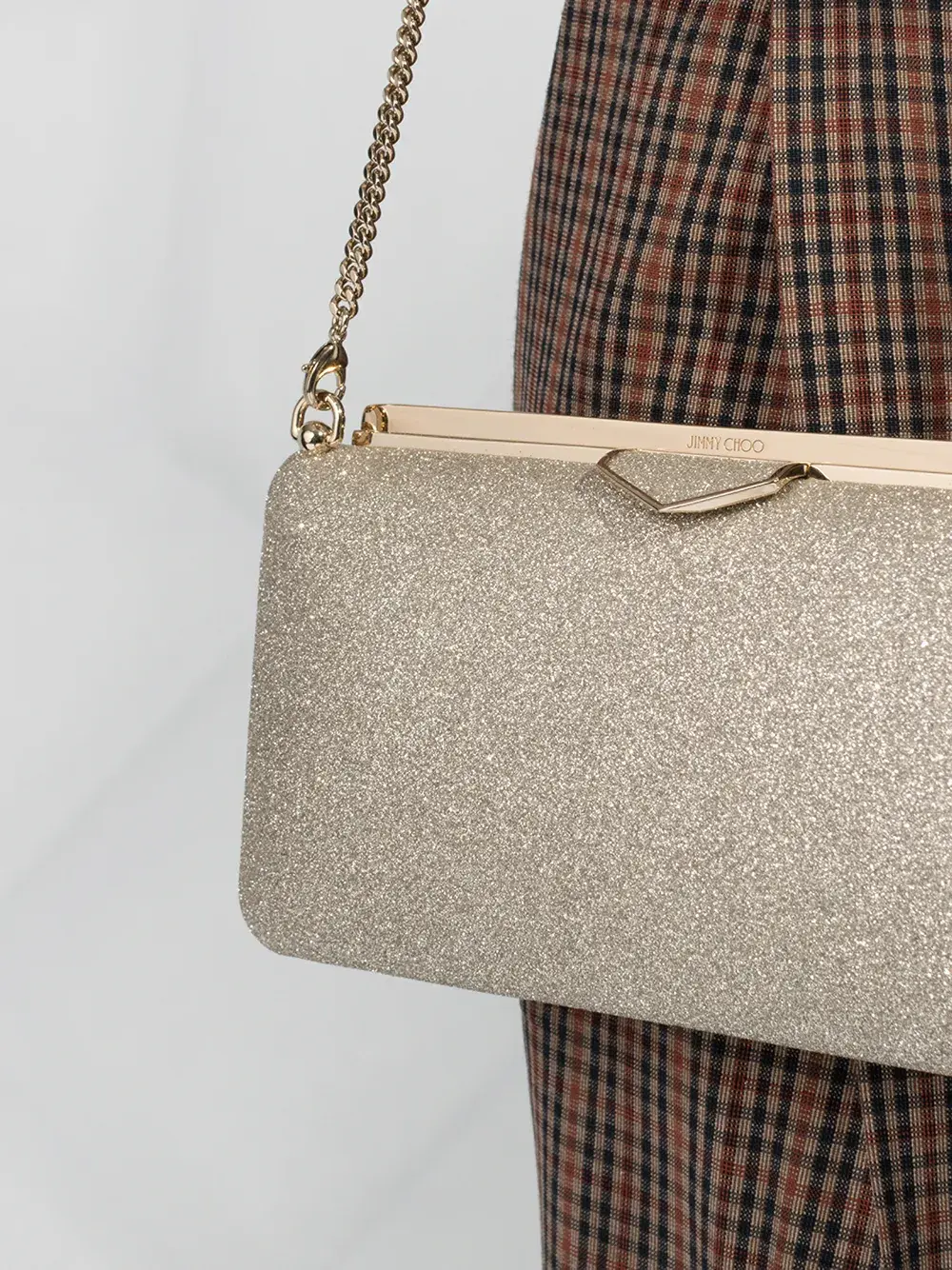 Ellipse clutch от JIMMY CHOO. Блестящий материал, застежка-защелка сверху, золотистая цепочка на плечо и внутренняя вставка с логотипом.