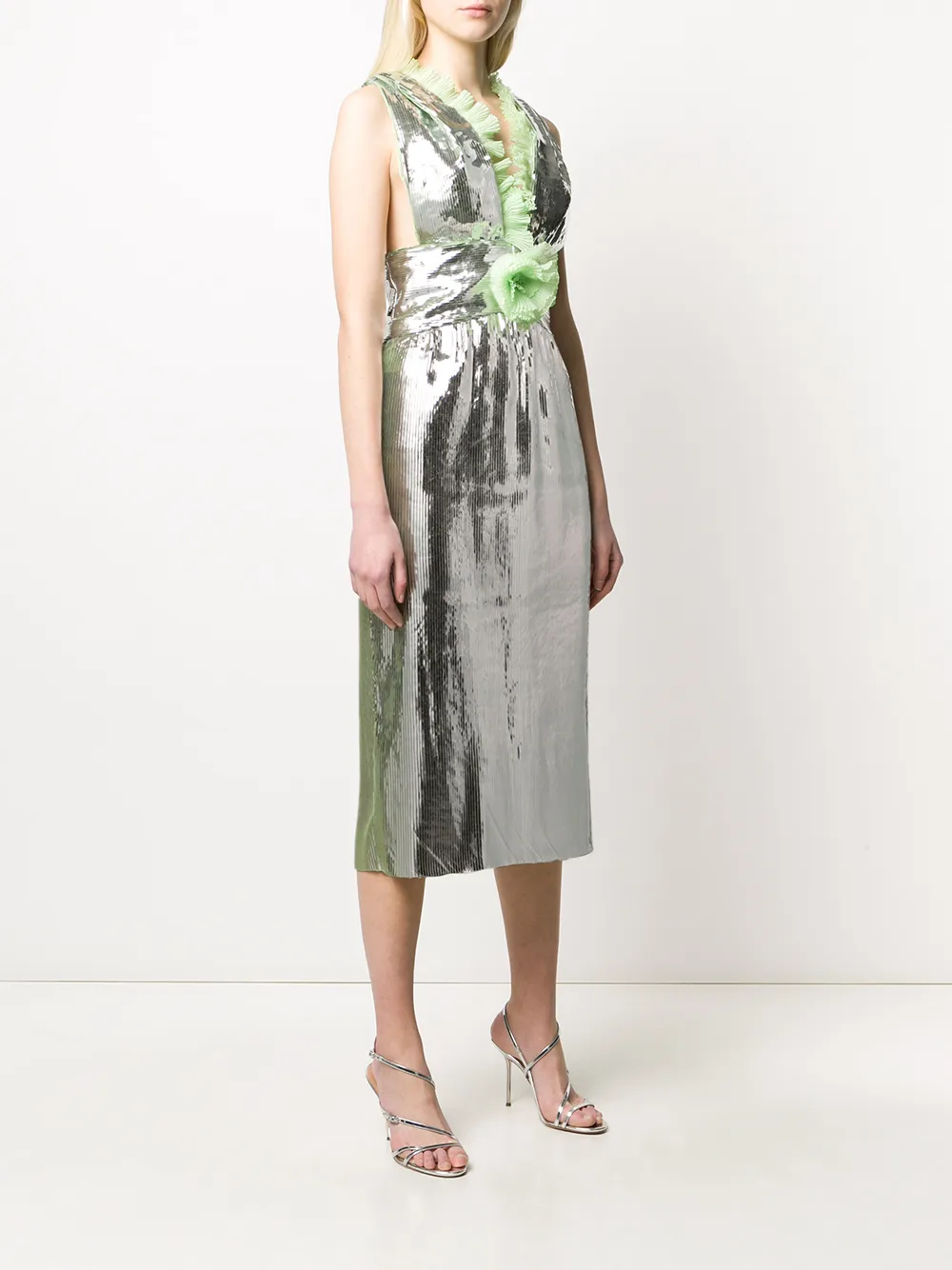 Платье миди с оборками от Marco De Vincenzo. Модель по фигуре, эмпирическая линия талии, затянутая талия, V-образная горловина, потайная застежка на молнии сбоку, модель без рукавов, аппликация в форме цветов и длина по колено.