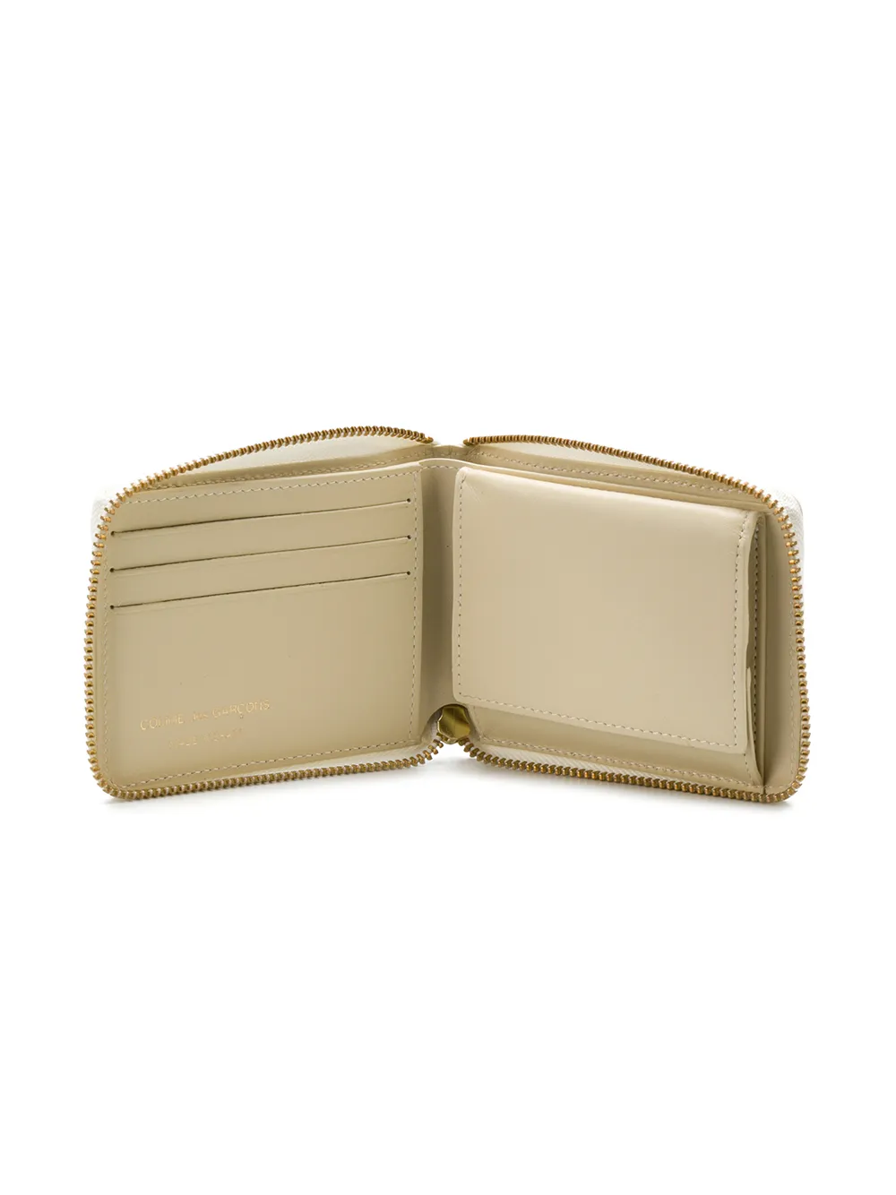 Белый кожаный классический кошелек на молнии от Comme Des Garçons Wallet. Круговая молния, внутренний карман на защелке, золотистая фурнитура.