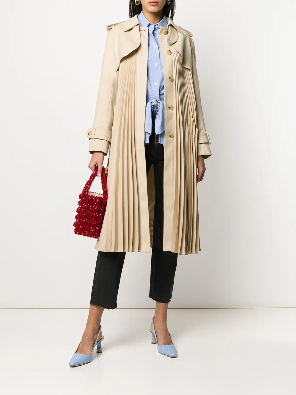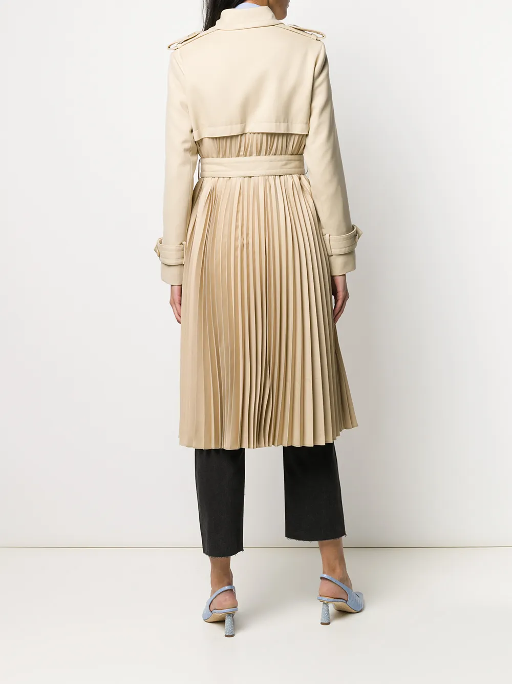 Плиссированный тренч Vino от Sandro Paris. Плиссированный дизайн, эполеты на плечах, длинные рукава, клапан для защиты от ветра, талия на завязке и застежка спереди.