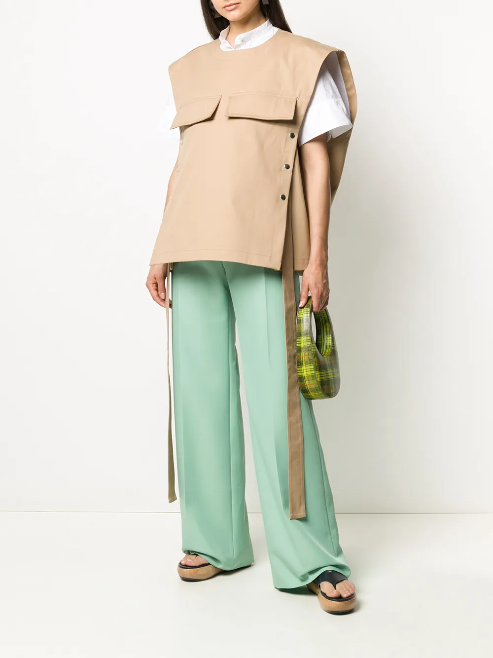 Два нагрудных кармана с клапанами, без рукавов и прямой подол.