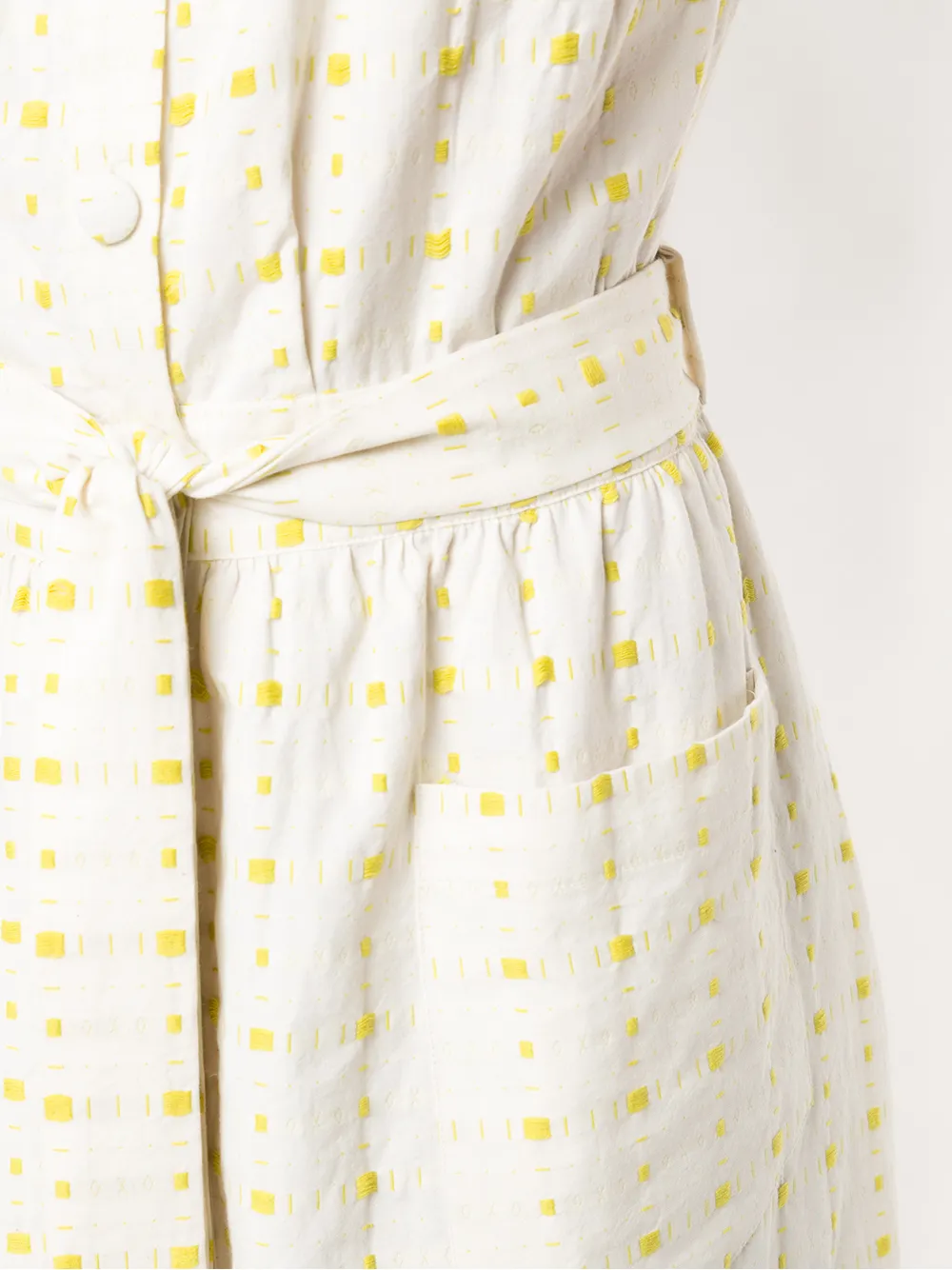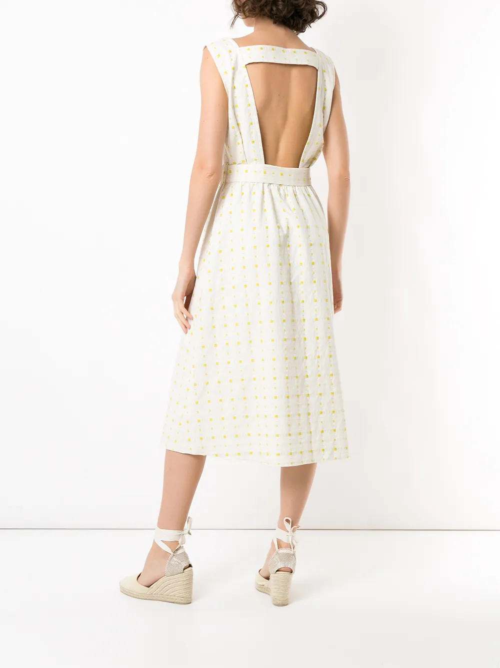 Платье миди Niniek от Clube Bossa. Модель без рукавов, прямой ворот, застежка на пуговицах спереди, фактурная модель, отрезная деталь, деталь со складками и ремень на талии.