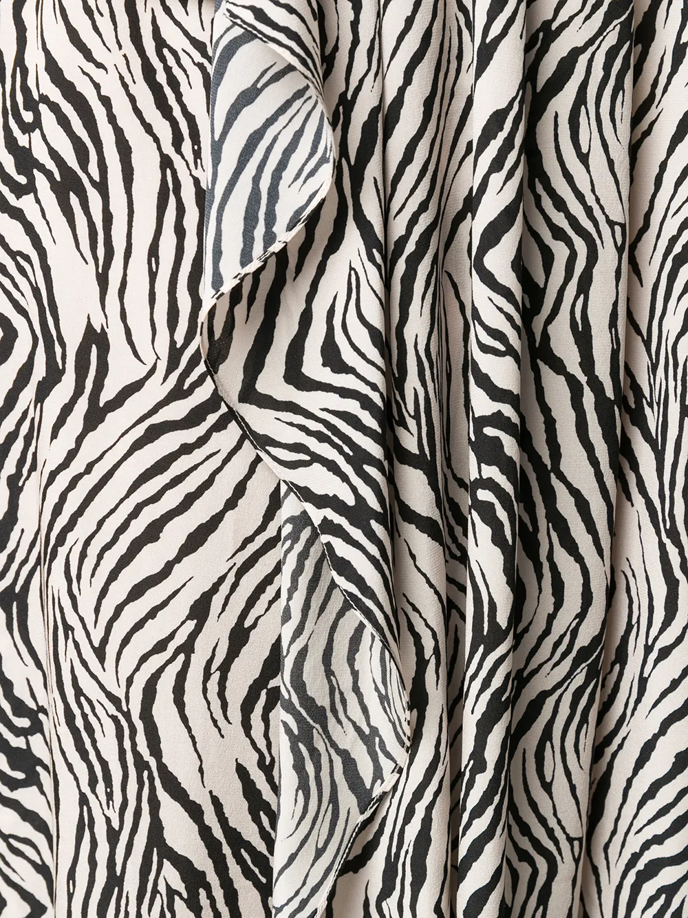 Вставки с оборками, зебровый принт, V-образный вырез, длинные рукава и длина миди.