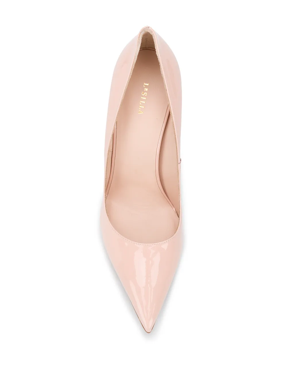 Заостренный носок, каблук-шпилька, стелька с логотипом и кожаная подошва.