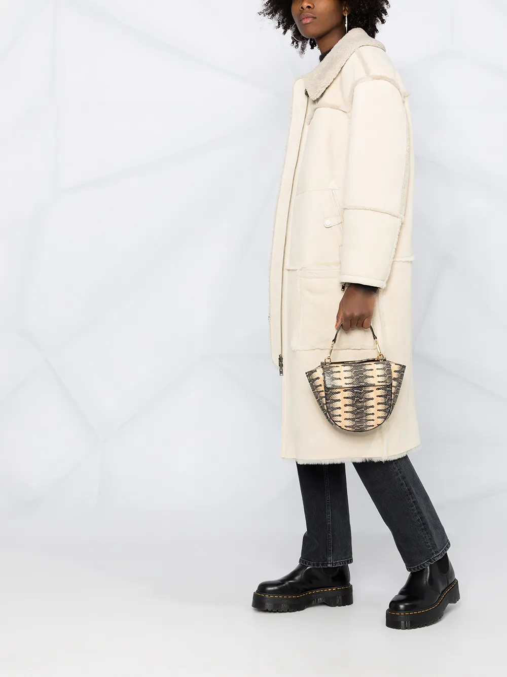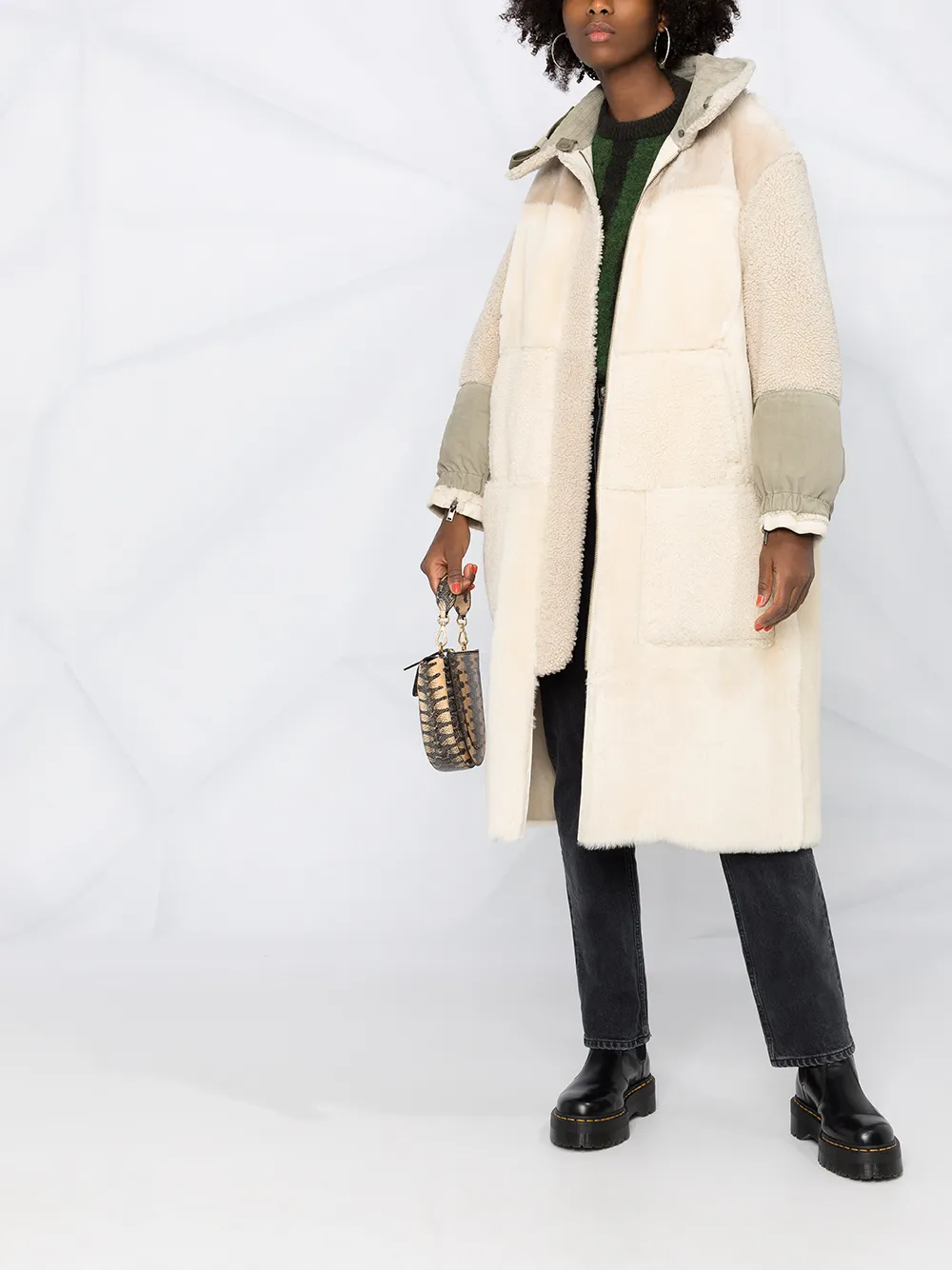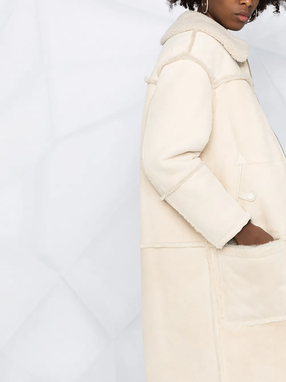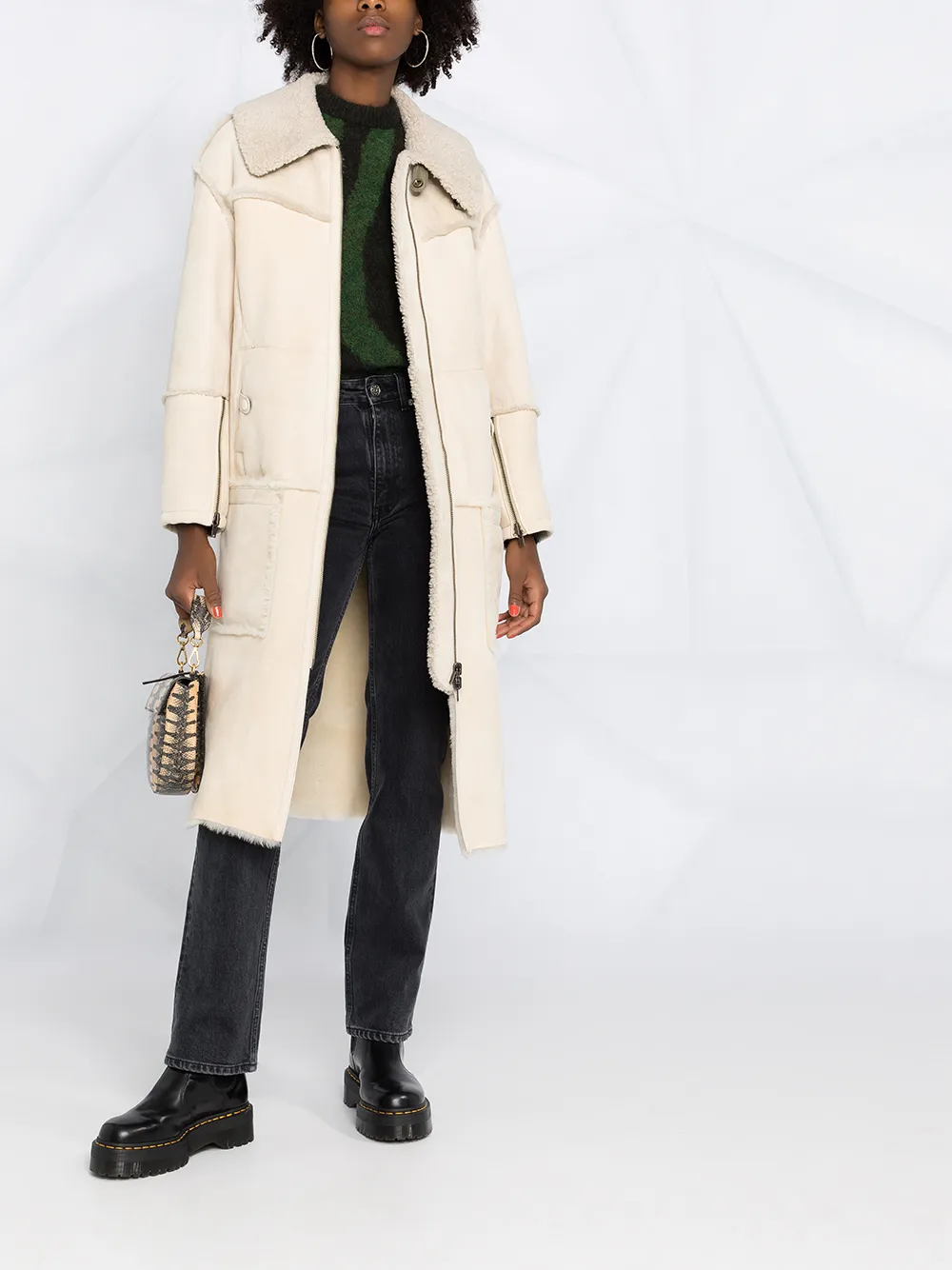 Подкладка из овечьей шерсти, контрастные вставки, застежка на молнии спереди, удлиненный воротник, длинные рукава, два вшитых кармана по бокам и длина миди. Цвет: белый.