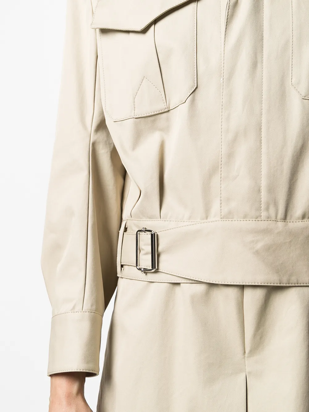 Отложный воротник, эполеты, потайная пуговичная застежка спереди, два накладных кармана на груди, ремень на талии, встречная складка и рукава с манжетами на пуговицах.