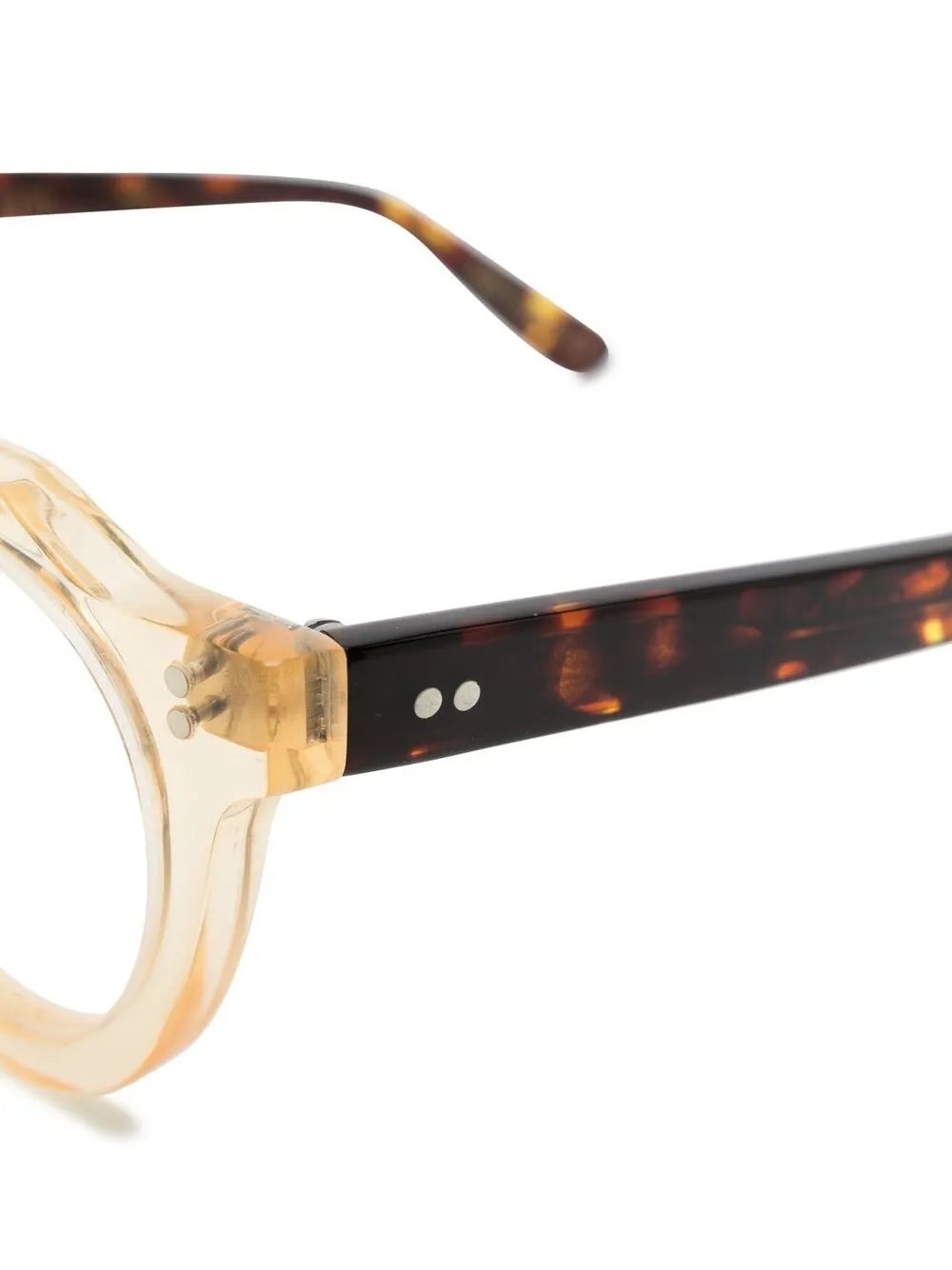 Прозрачный материал, черепаховая расцветка, круглая оправа, прозрачные линзы, прямые дужки и дужки с закругленными концами. Прилагается защитный чехол. Обратите внимание, что на FARFETCH продаются очки и оправы с линзами без диоптрий.