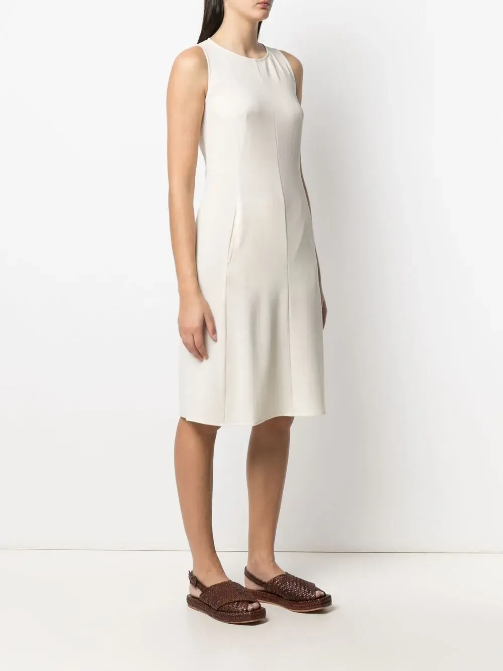 Узкий крой, без рукавов, круглый вырез и длина миди.