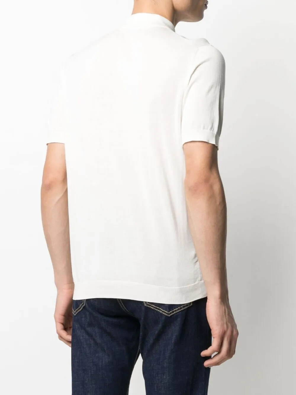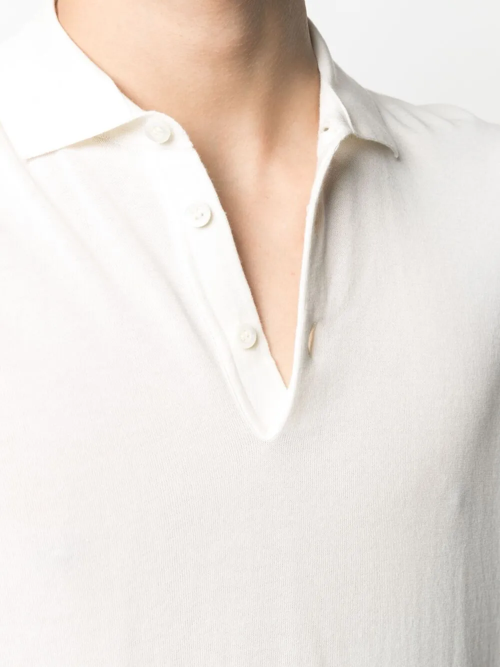 Воротник поло, короткая застежка на пуговицах спереди и короткие рукава.