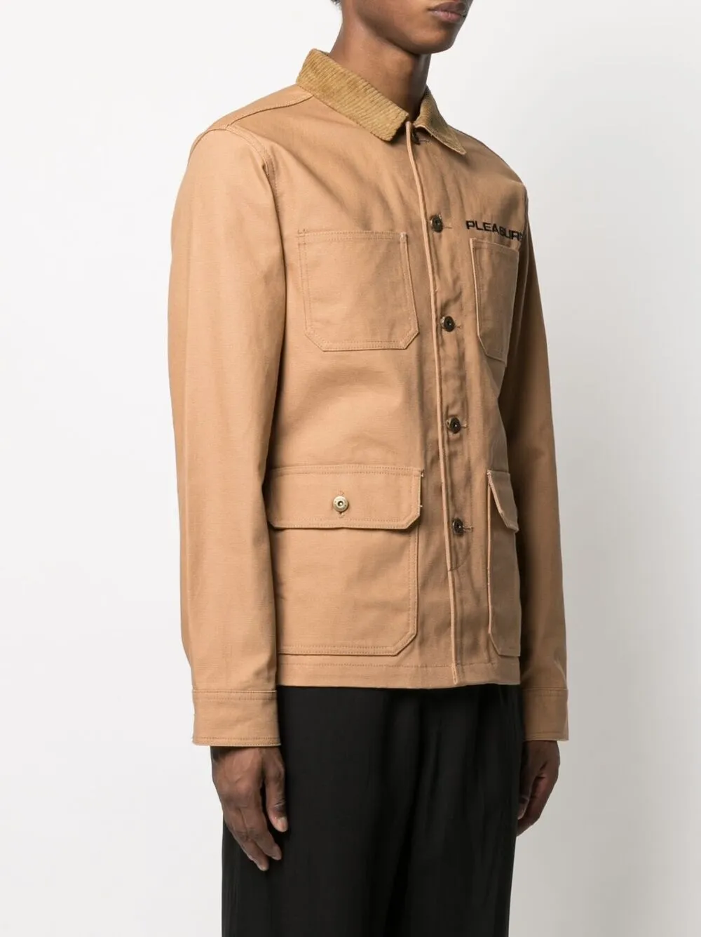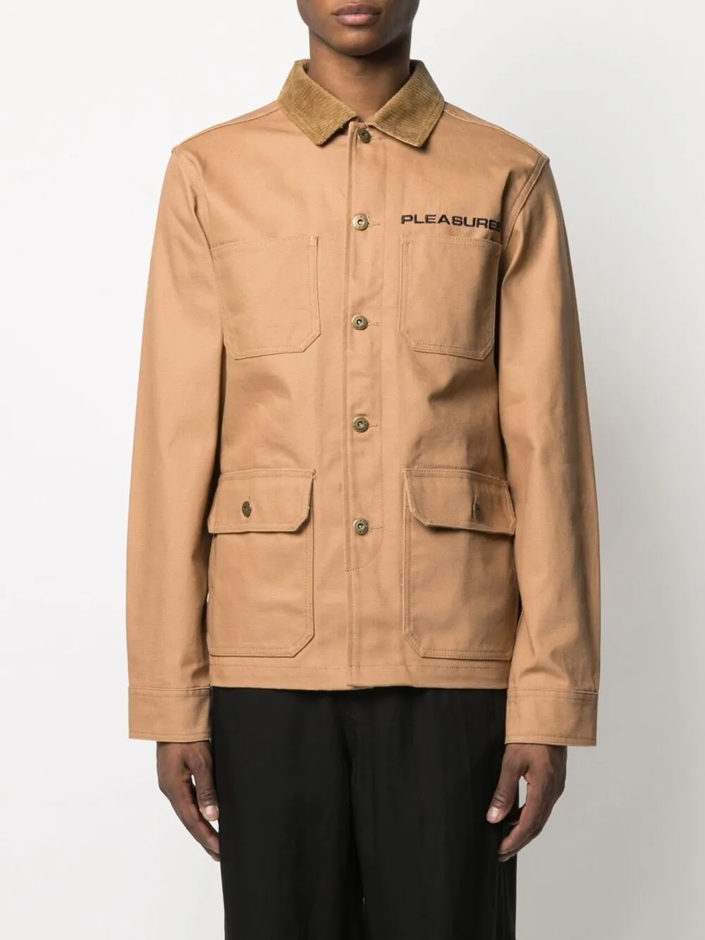 Классический воротник, застежка на пуговицах спереди, передние карманы с клапаном и графичный принт на спине.