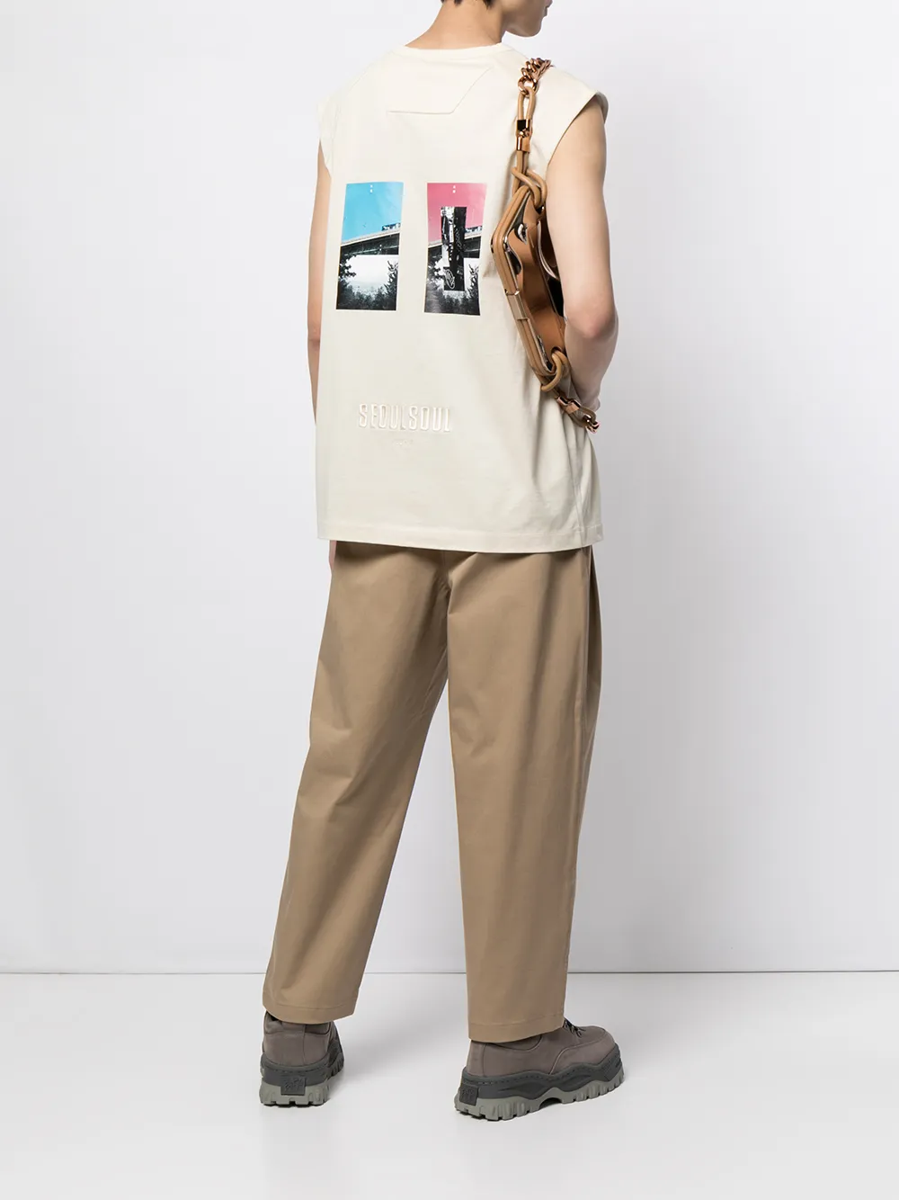 Круглый вырез, без рукавов, графичный принт на спине и прямой подол.