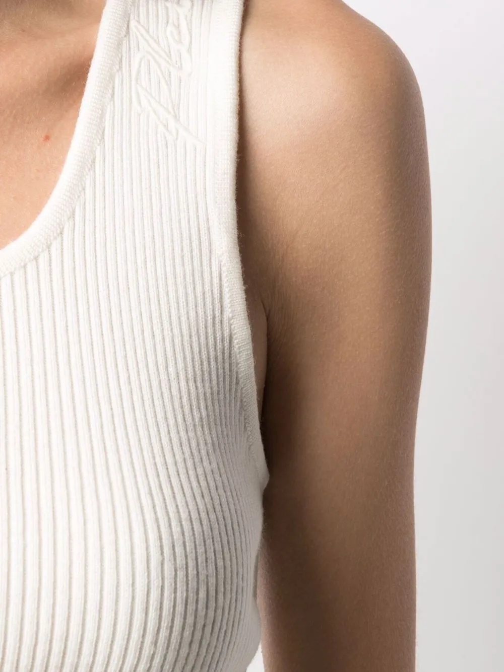 Трикотаж в рубчик, круглый вырез, без рукавов и прямой подол.