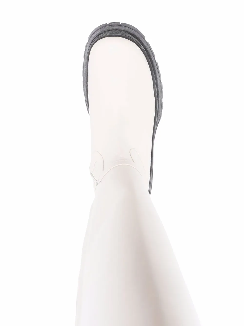 Петля для подтягивания сзади, закругленный носок, застежка на молнии сбоку, ребристая резиновая подошва и длина до середины голени.