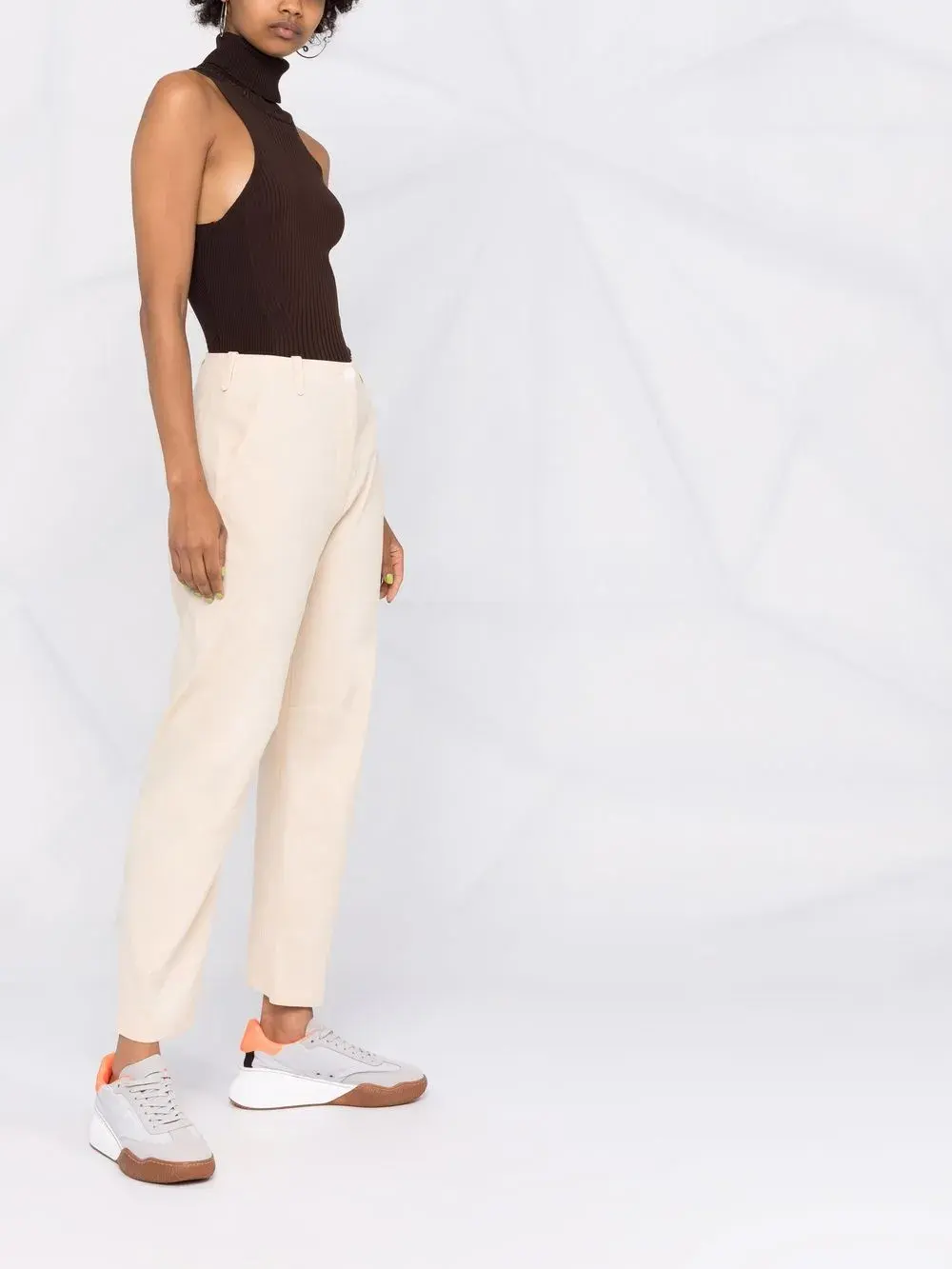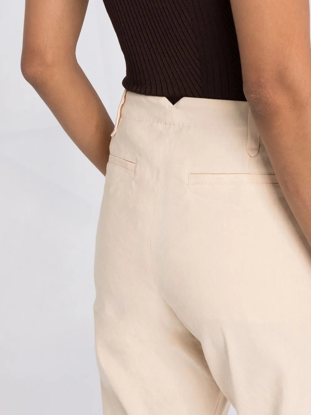 Завышенная талия, петли для ремня, застежка на молнии и пуговице спереди, два вшитых кармана по бокам, два кармана с листочкой сзади, узкий крой и укороченная длина. .