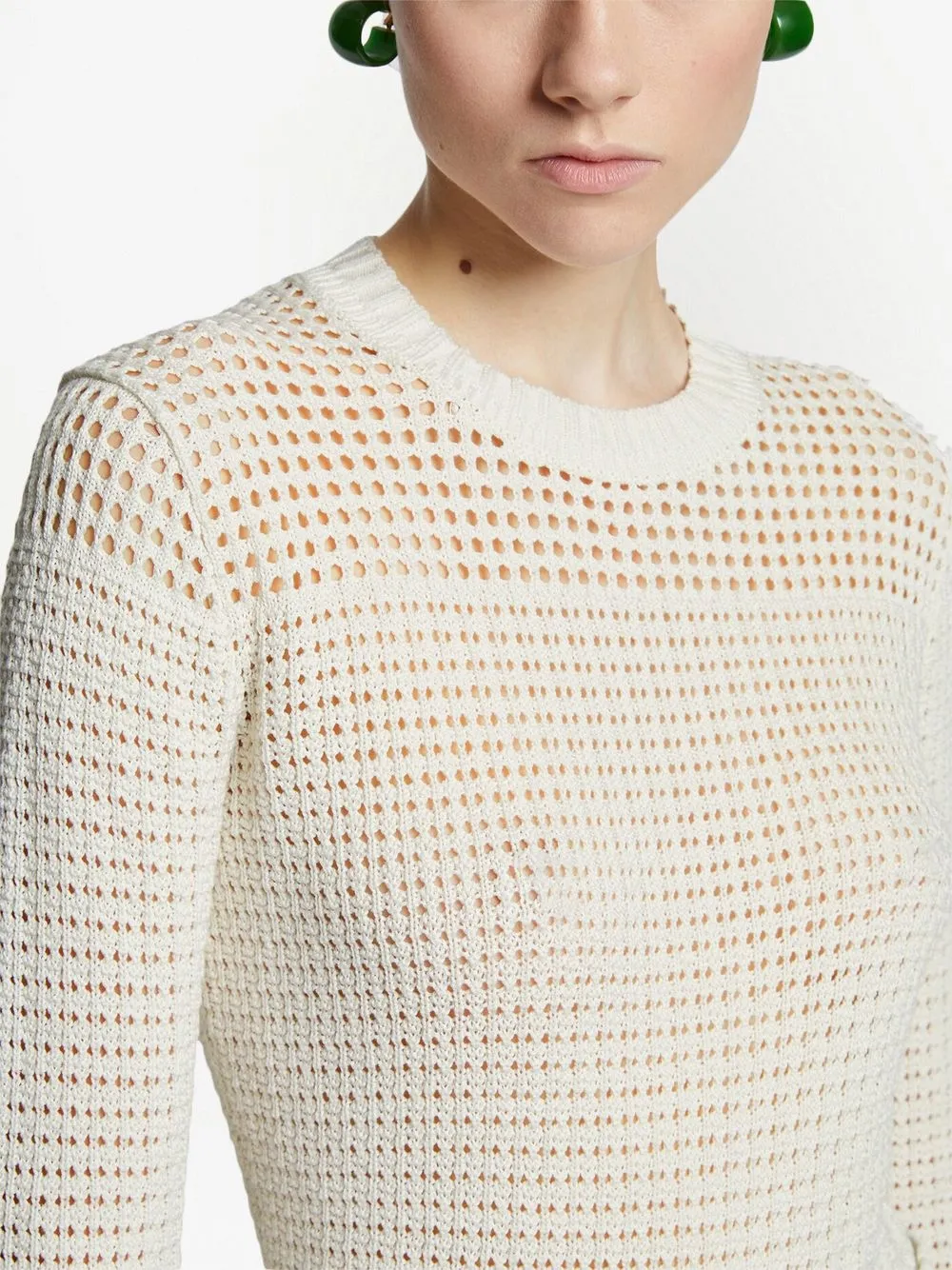 Кружевное вязание, круглый вырез, длинные рукава и подол с фестонами.