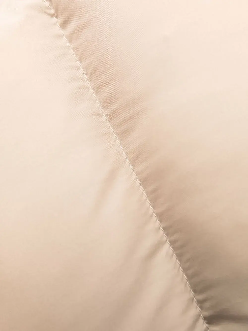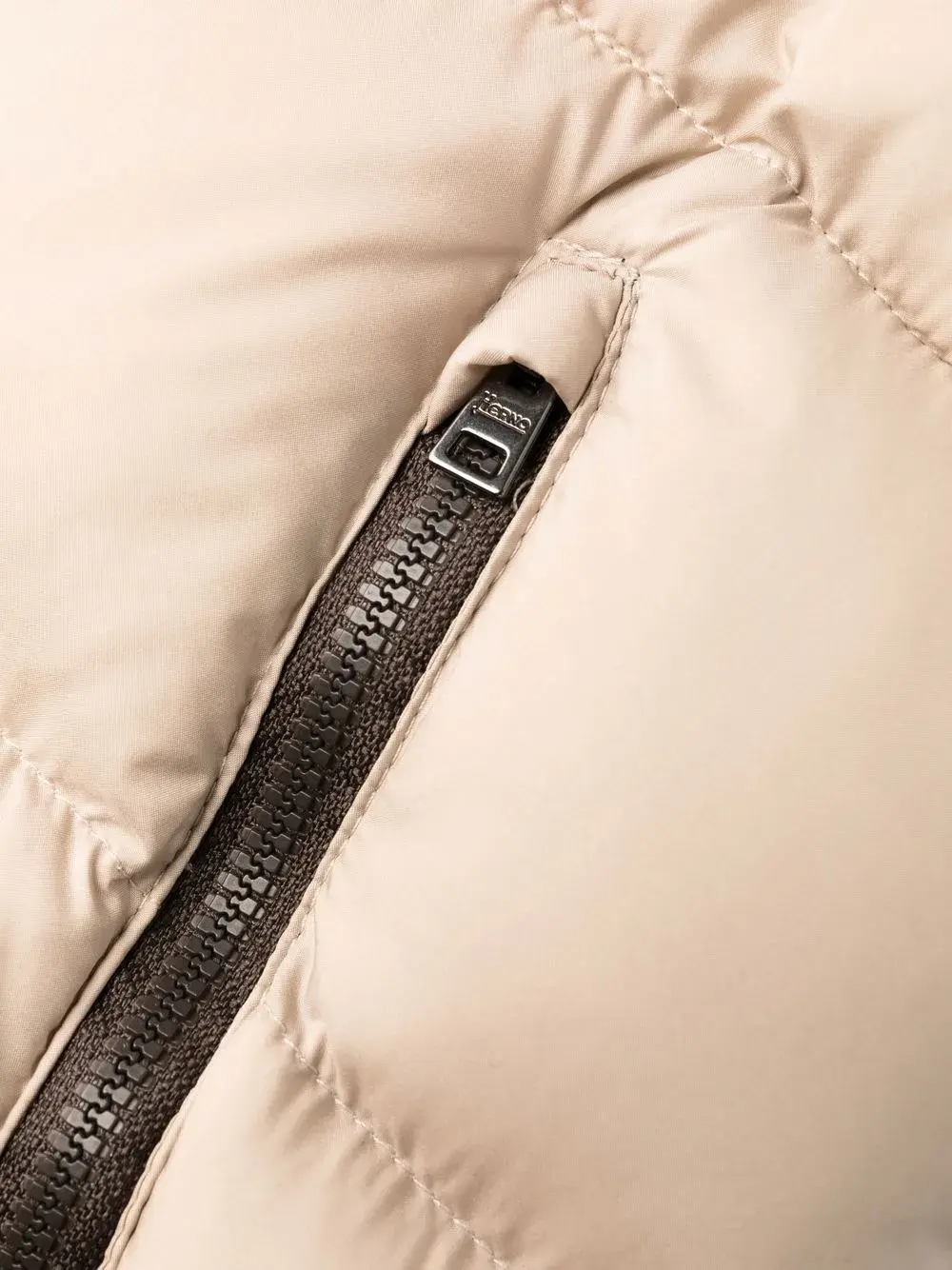 Стеганая модель, наполнитель из смеси пуха и пера, классический капюшон, застежка на молнии спереди, два кармана на молнии по бокам, длинные рукава и прямой подол.