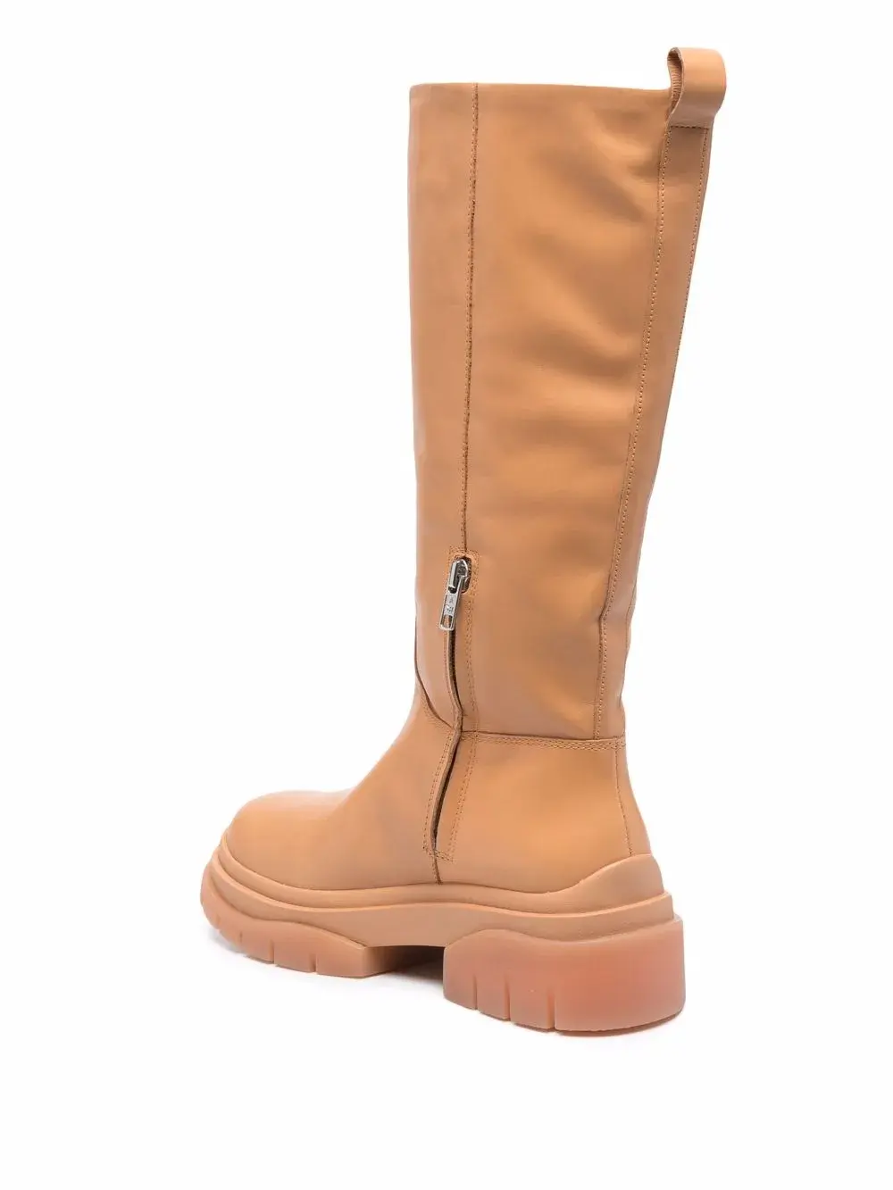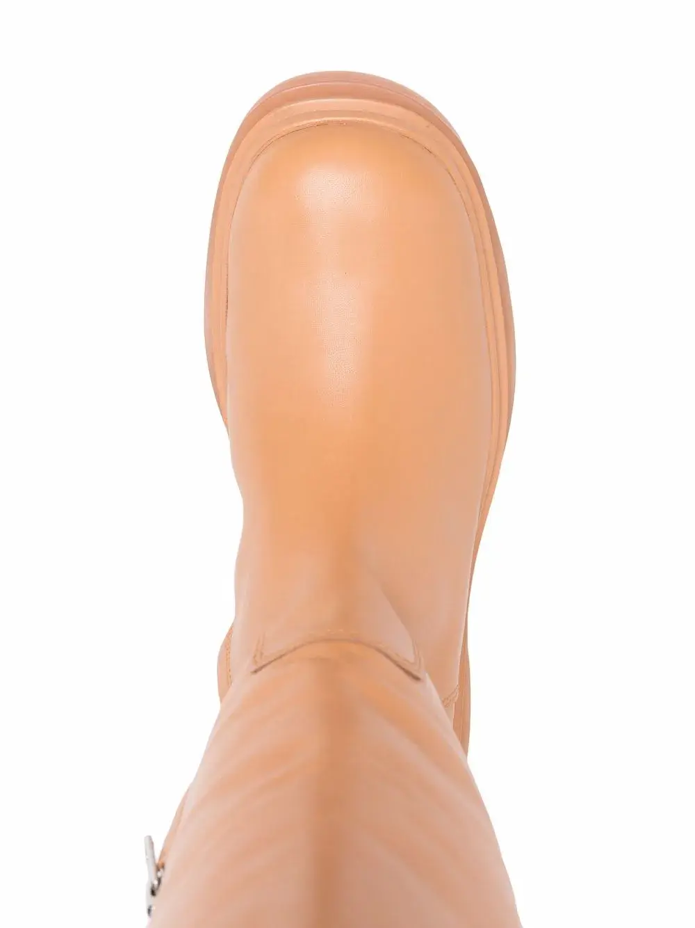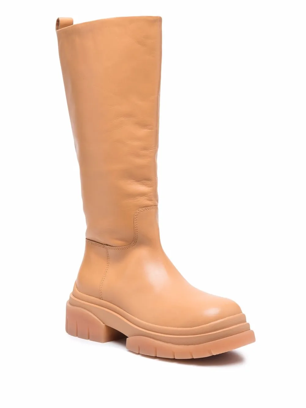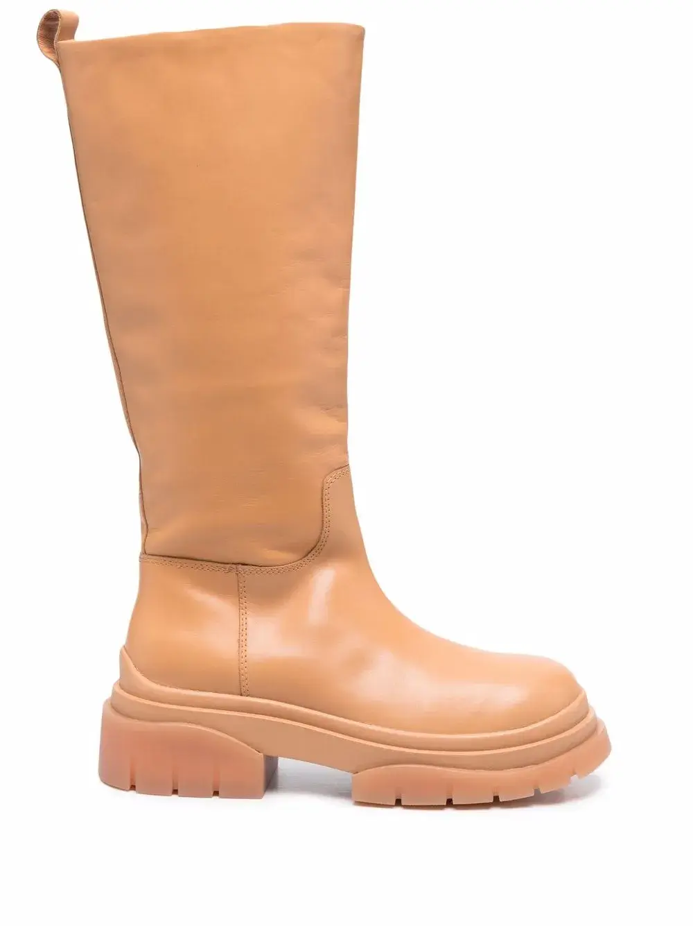 Тональная строчка, миндалевидный носок, застежка на молнии сбоку, длина до середины голени, стелька с логотипом, низкий ребристый каблук и ребристая резиновая подошва.