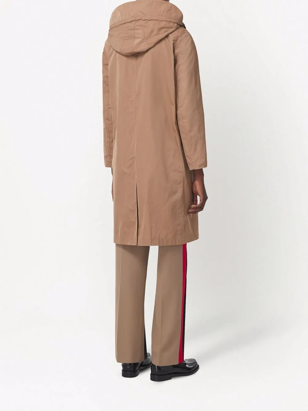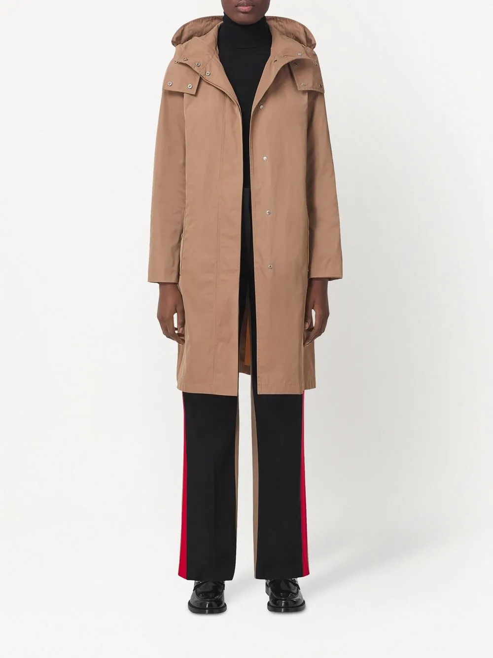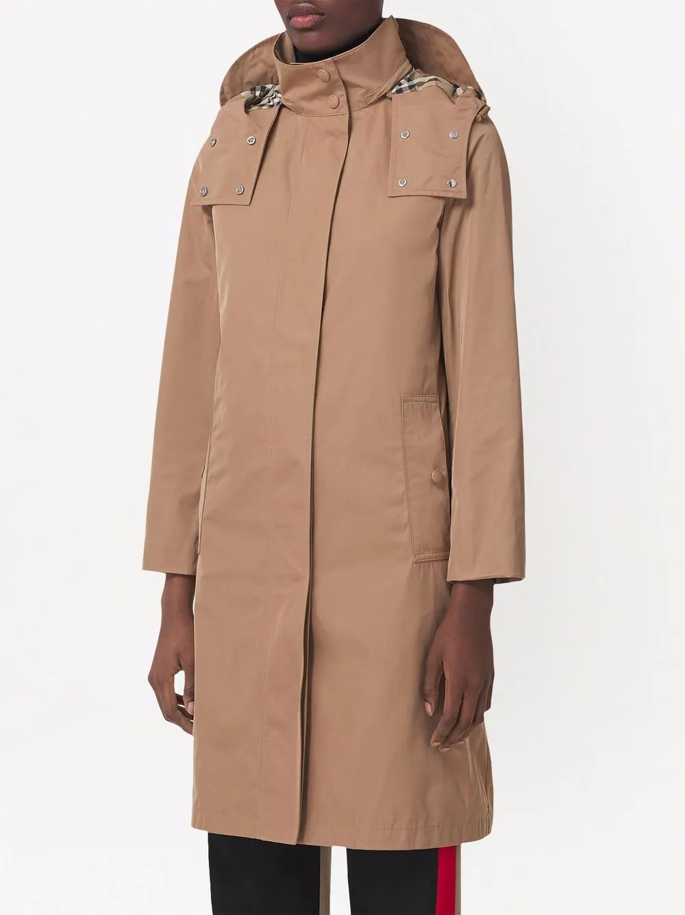 Цвет: кэмел съемный капюшон воротник-труба потайная застежка спереди длинные рукава два прорезных кармана по бокам шлица по центру сзади длина миди подкладка в клетку Vintage Check