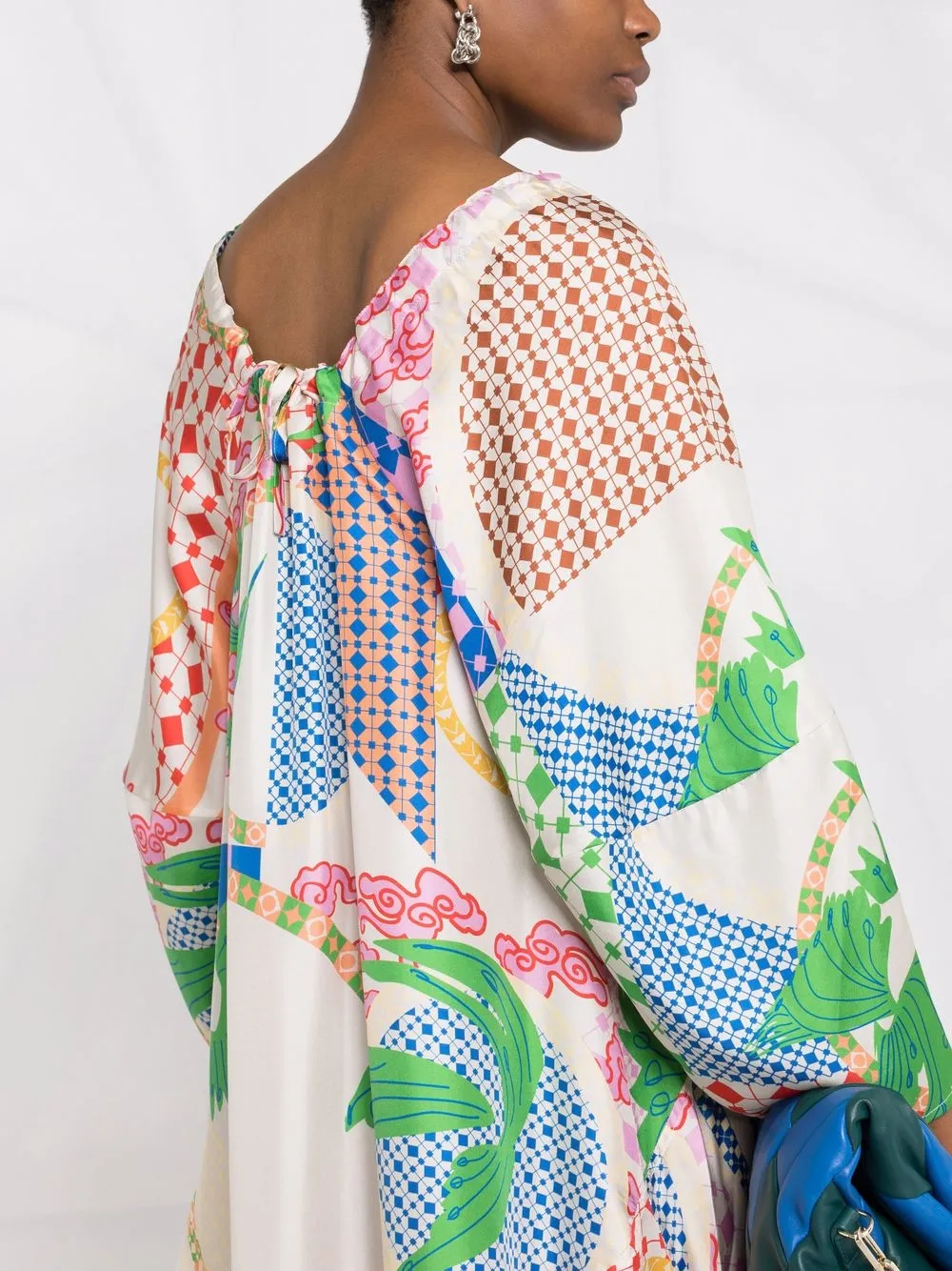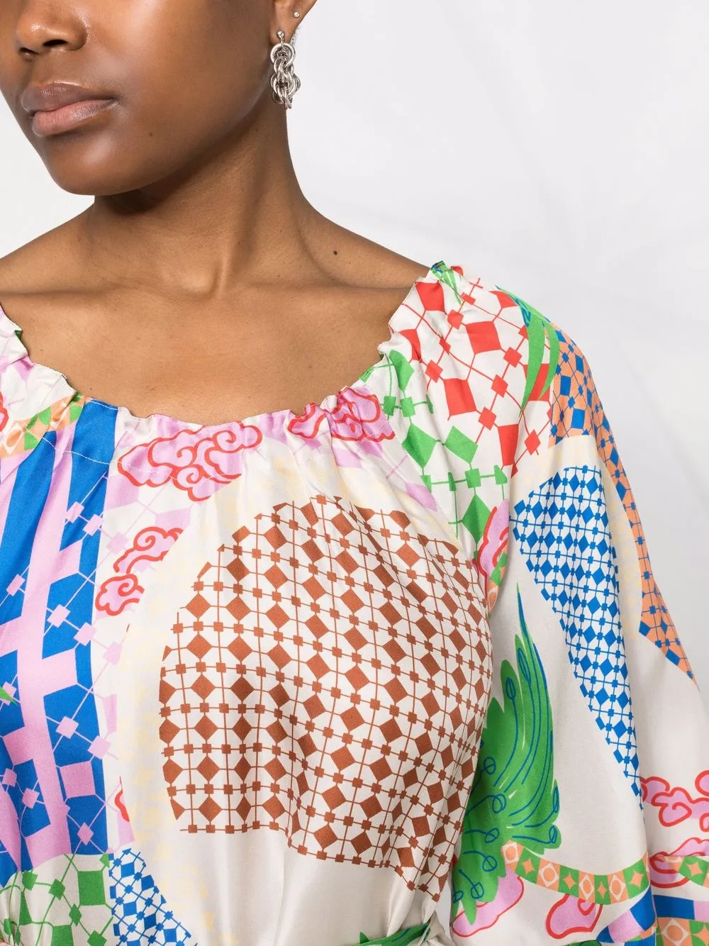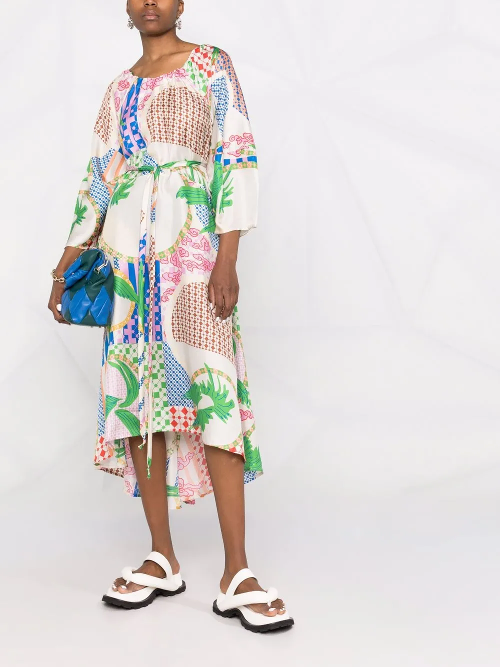 Геометричный принт, круглый вырез, рукава три четверти и расклешенный подол. Цвет: разноцветный.