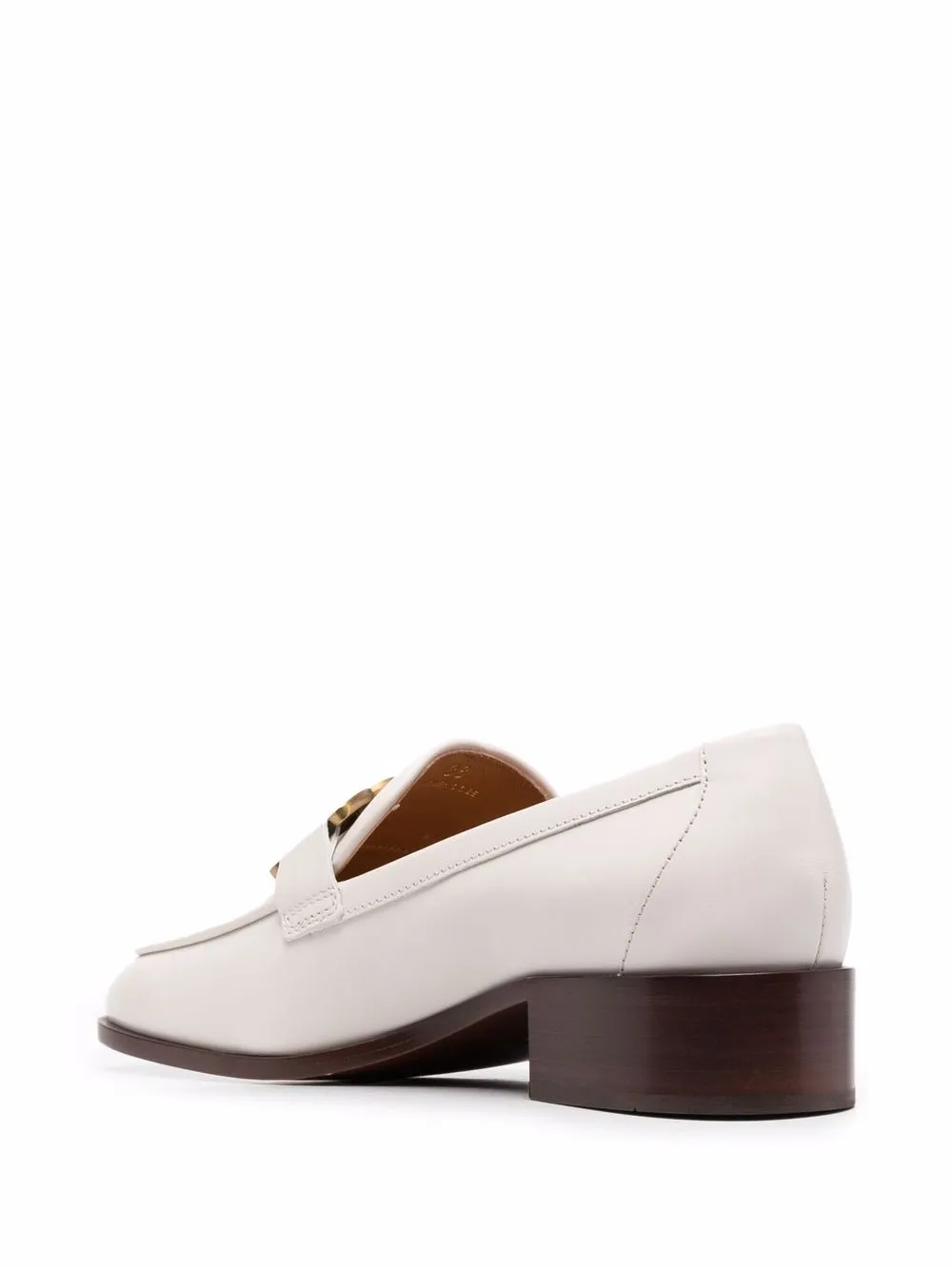 Золотистый металлический логотип, миндалевидный носок, модель без застежки, кожаная стелька с логотипом и низкий блочный каблук.